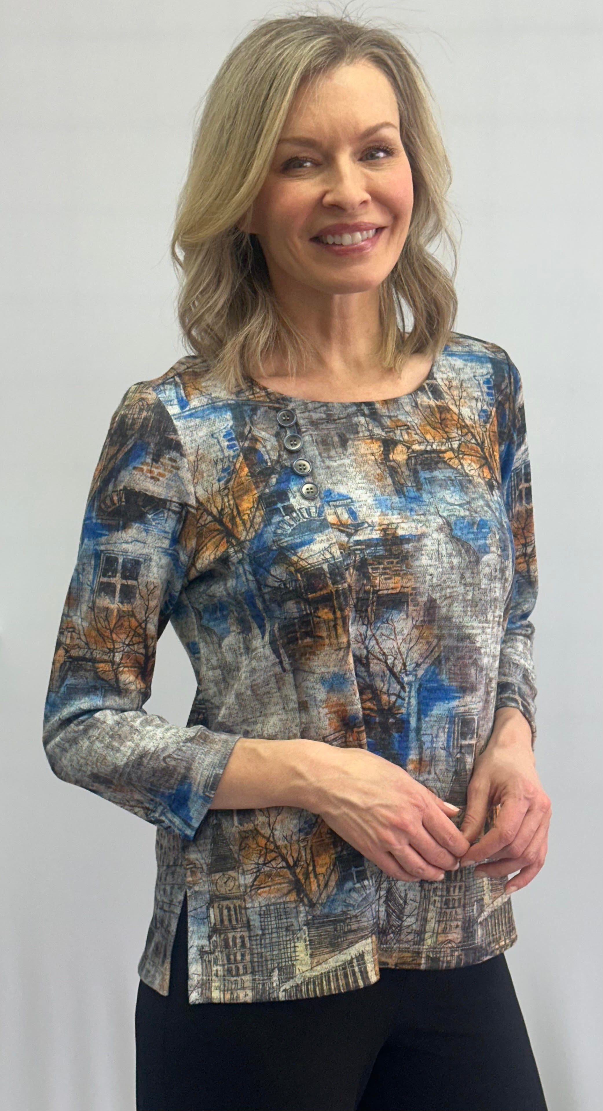 • Quatre boutons élégants, dans les mêmes teintes que le haut, décorant l’encolure à droite, suivis d’une couture ton sur ton s’étendant de l’encolure jusqu’au bas.