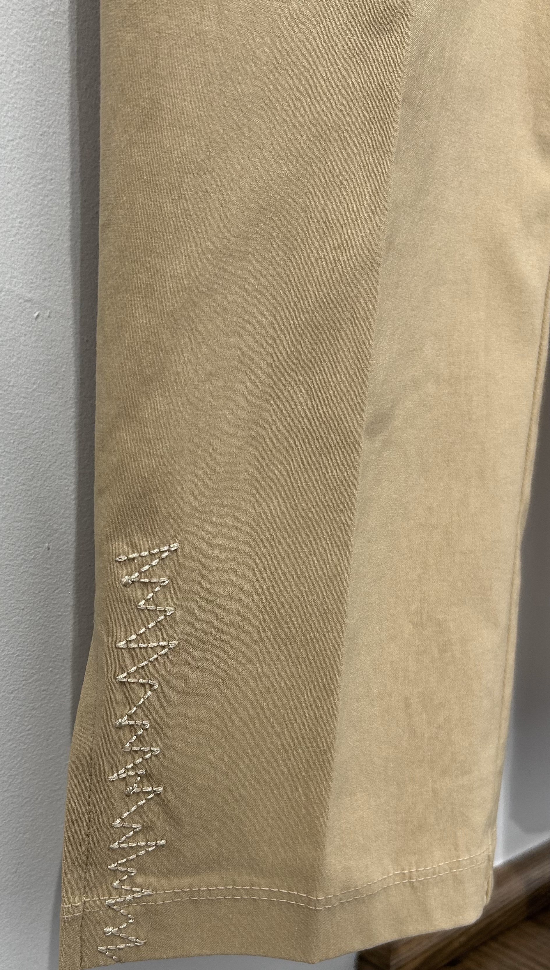 Tone-on-tone embroidery and decorative slits at the bottom of the leg