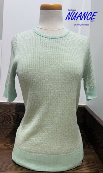Elegant round neckline : Enhanced with a tightly knitted mint green band, providing a subtle and refined finish.