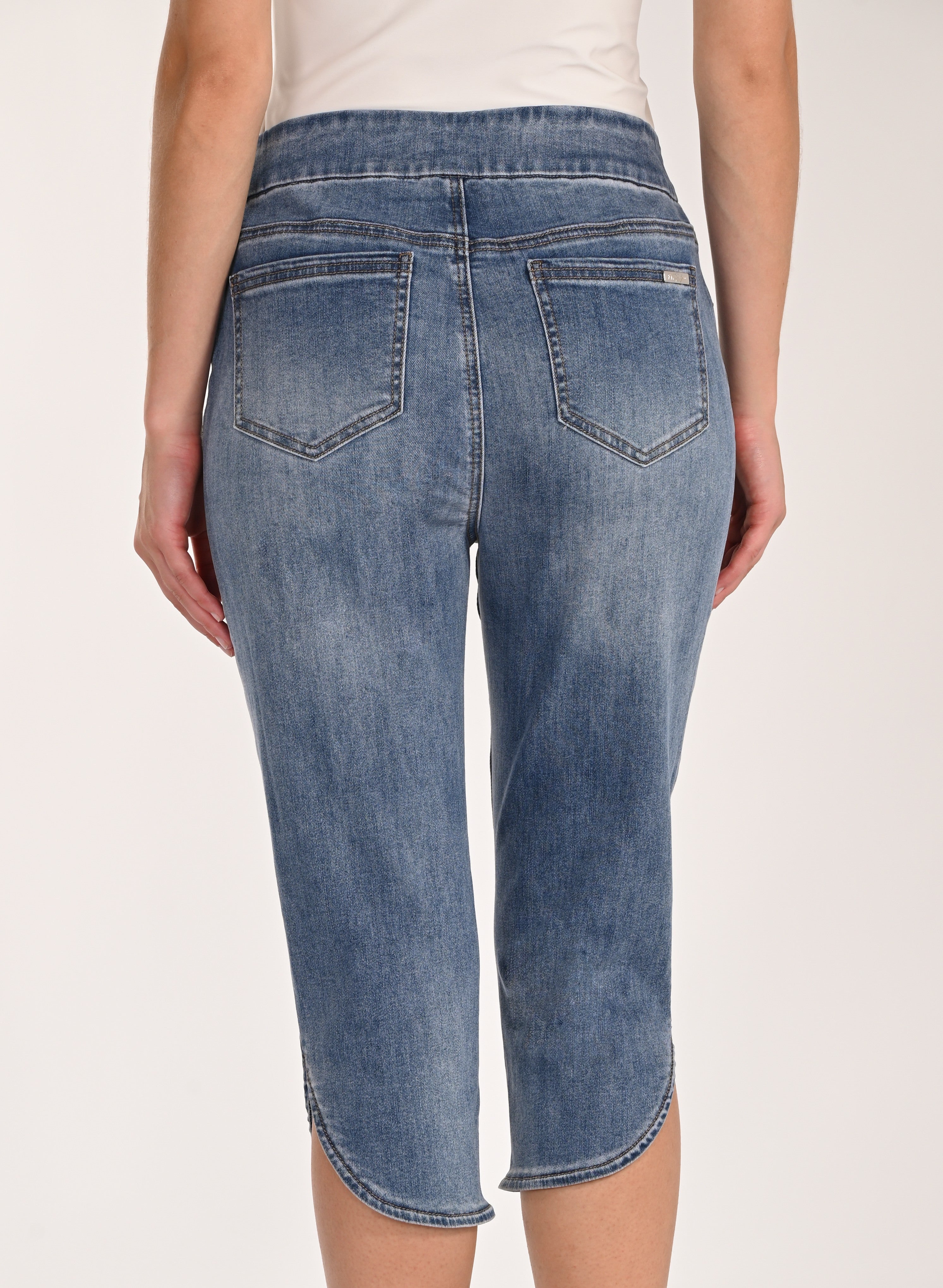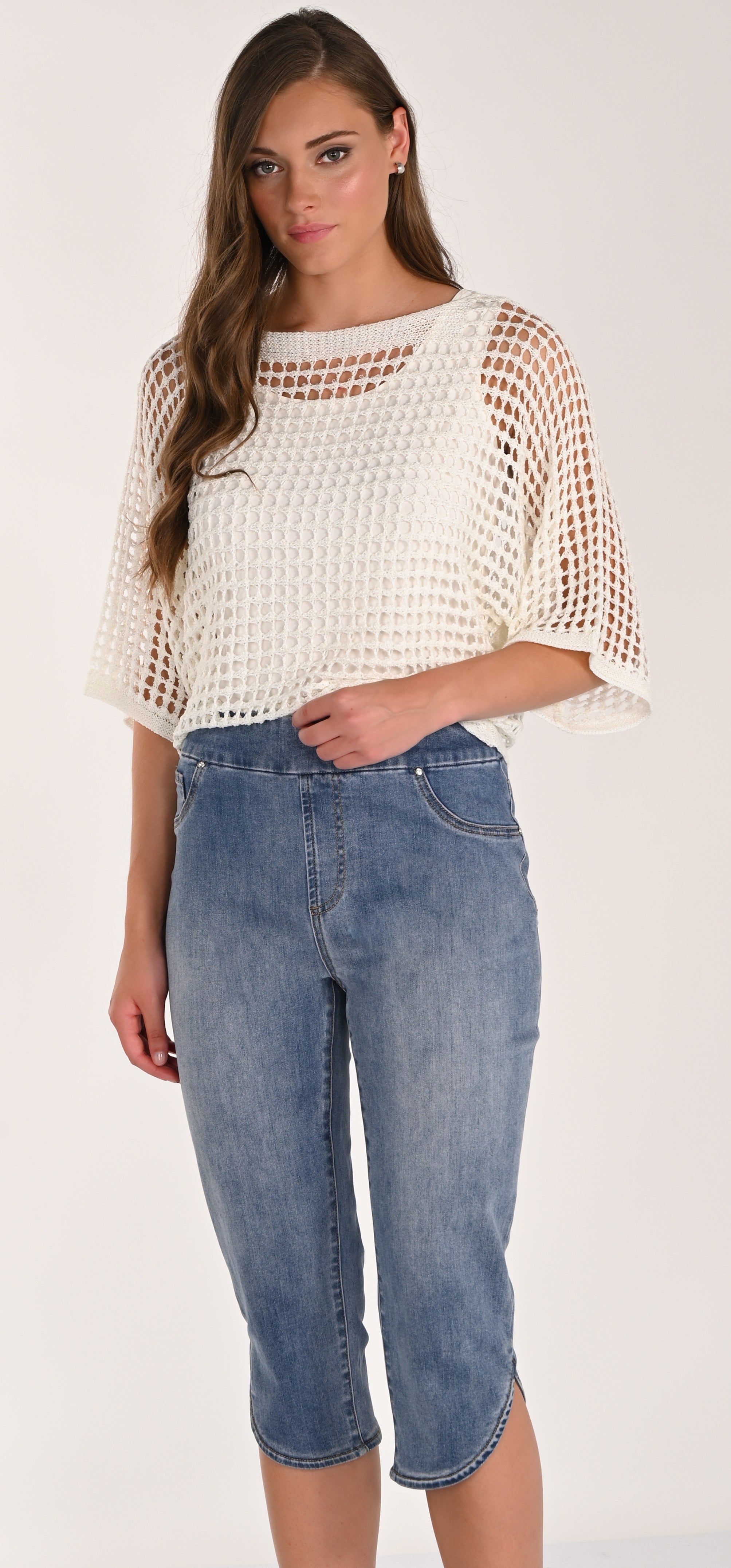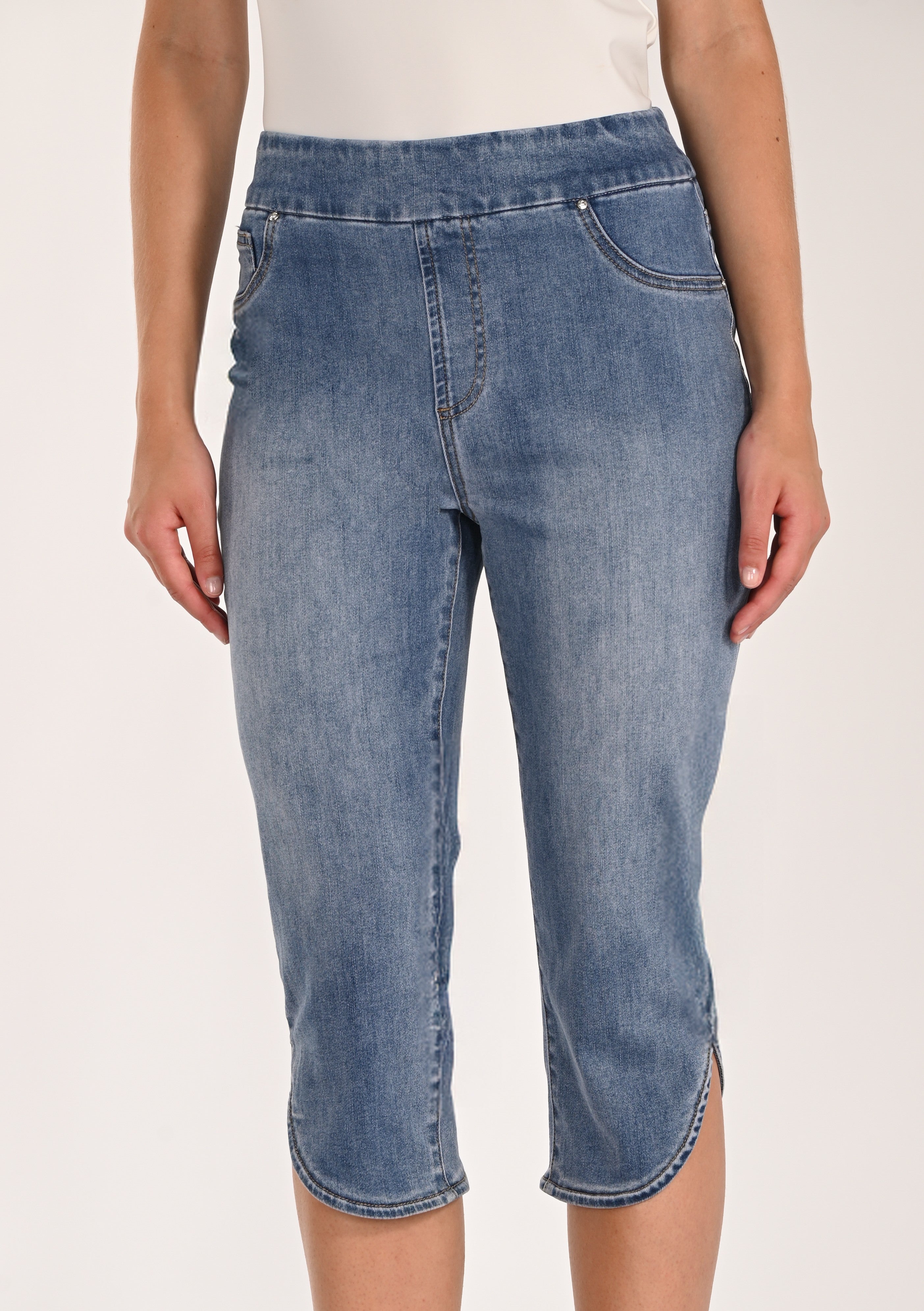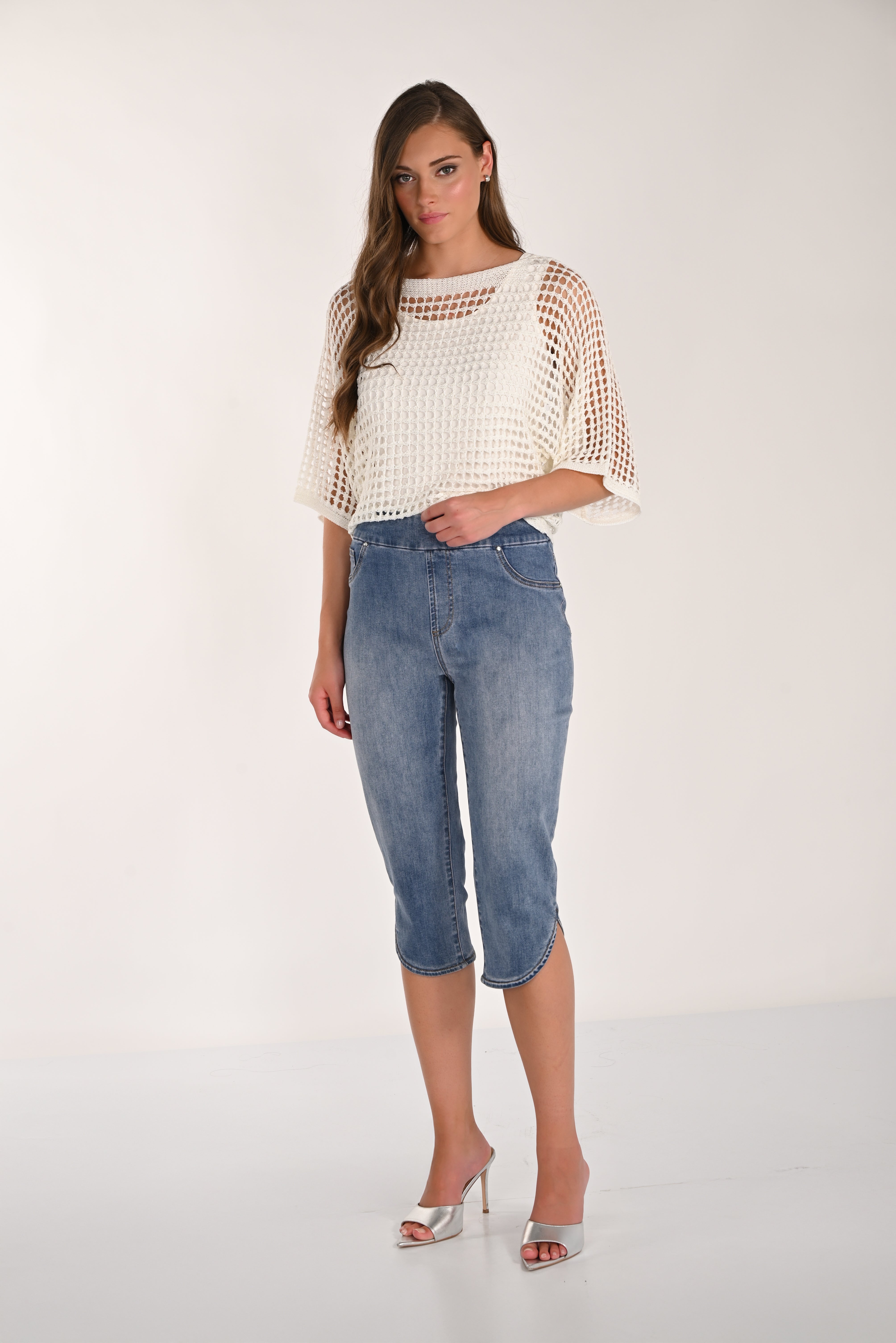 These pull-on capri jeans impress with their comfort and polished look. Crafted from washed denim, they feature real front and back pockets, as well as a faux fly for a stylish finish. External side slits and a rounded hem add a modern and flattering touch. A discreet Frank Lyman authenticity tag is affixed to the back. Versatile and refined, these capris are ideal for summer, perfect for everyday wear or more formal occasions.