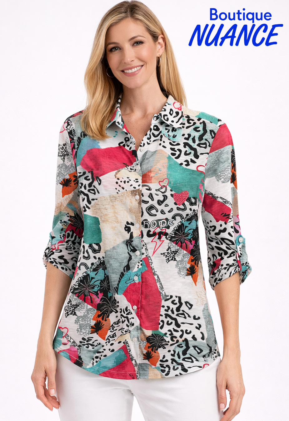 This stunning blouse is distinguished by its classic shirt collar, elegantly finished with a mandarin collar, and its three-quarter length sleeves with adjustable buttons. The slightly rounded hem adds a touch of fluidity to the silhouette. Its vibrant and expressive design boldly combines animal prints, hearts, lightning bolts, and graphic shapes in bright colors, creating a confident and decidedly fashionable style. Lightweight and comfortable, this blouse is equally suited to a professional look or a night out on the town where originality and elegance are key. It can also be layered depending on the season.