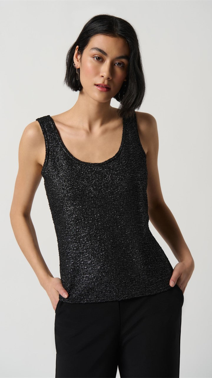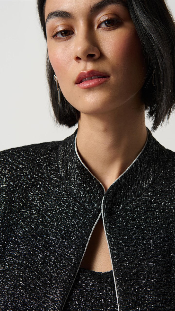 Elevate your daily style with this modern two-piece set, including a fitted jacket and a camisole by Joseph Ribkoff. The fitted jacket is crafted from foiled textured knit, featuring a stand collar, hook and eye closure, and three-quarter sleeves. Elastic piping around the garment provides a comfortable and adjusted fit, while the scoop neckline of the camisole allows you to show off statement jewelry.