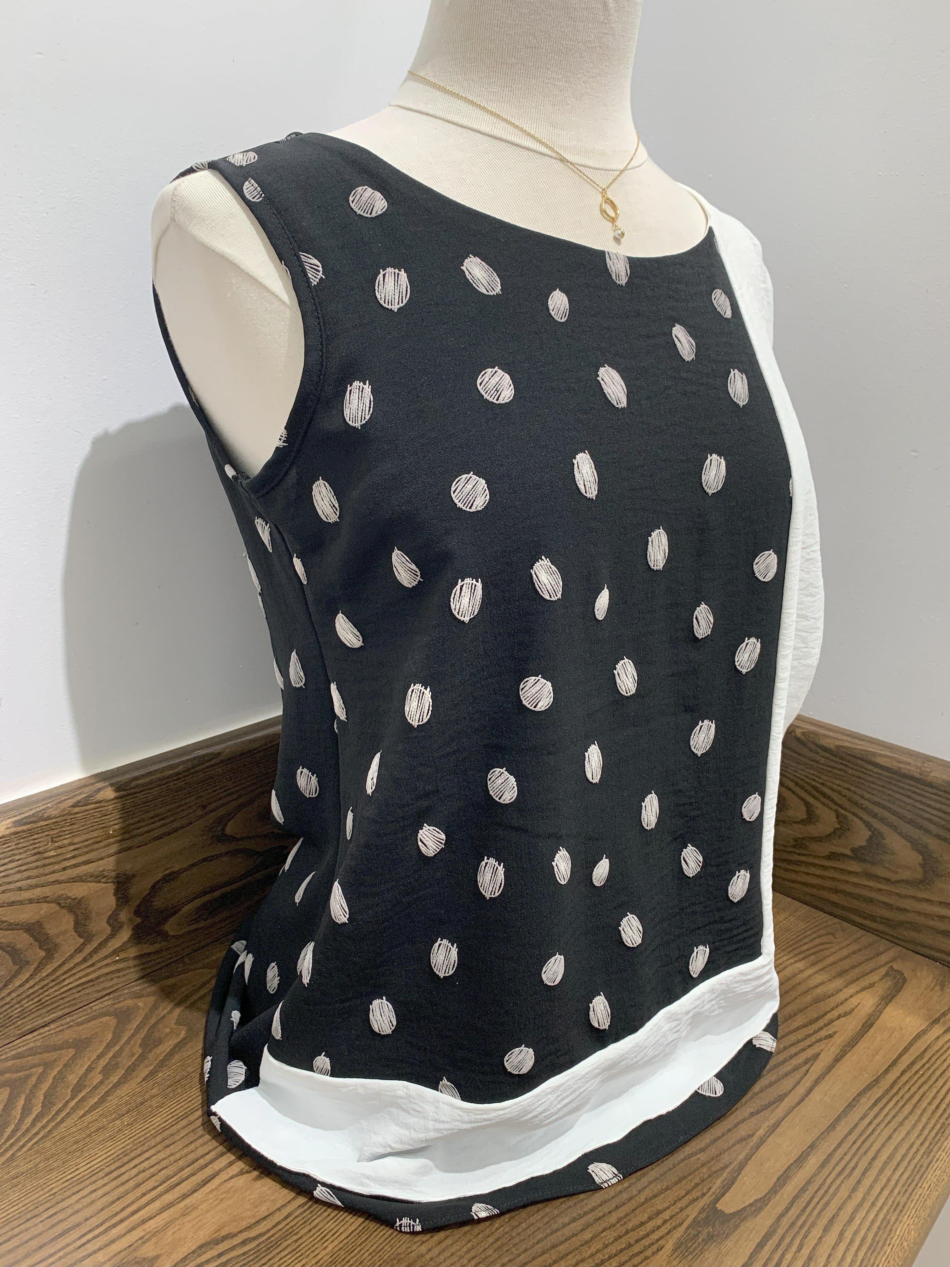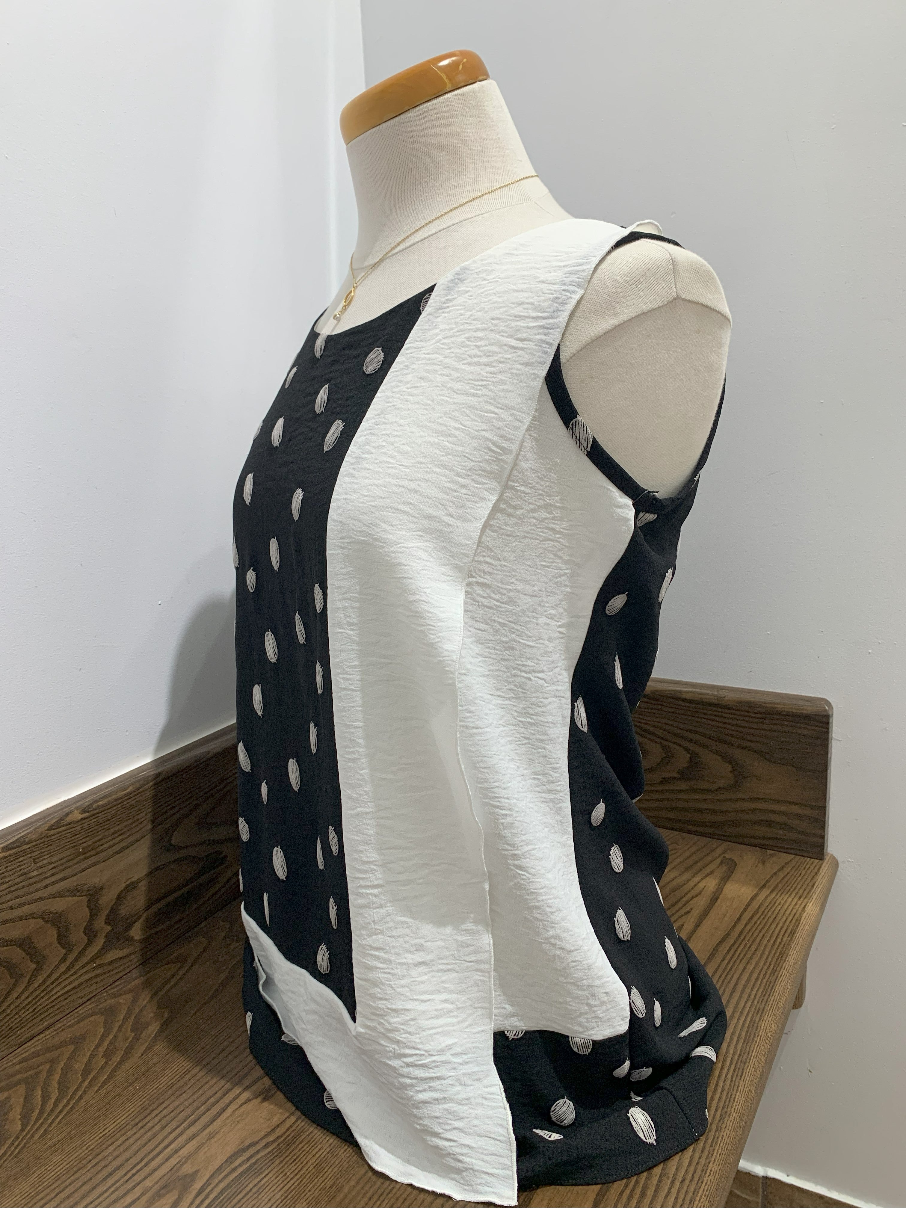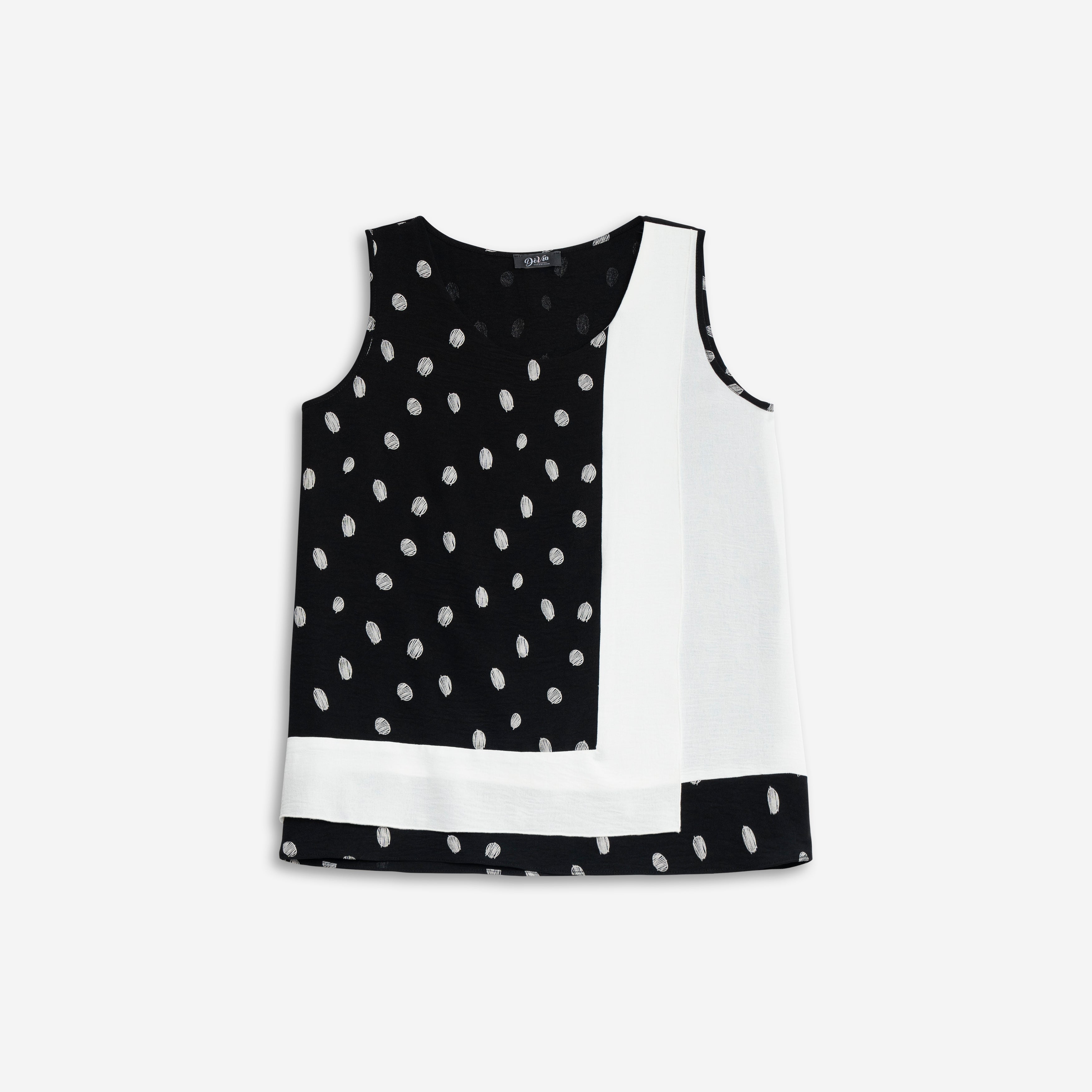 This sleeveless top, offered by Dévia , displays a graphic and modern design, mixing prints and color contrasts for a sophisticated and original look.