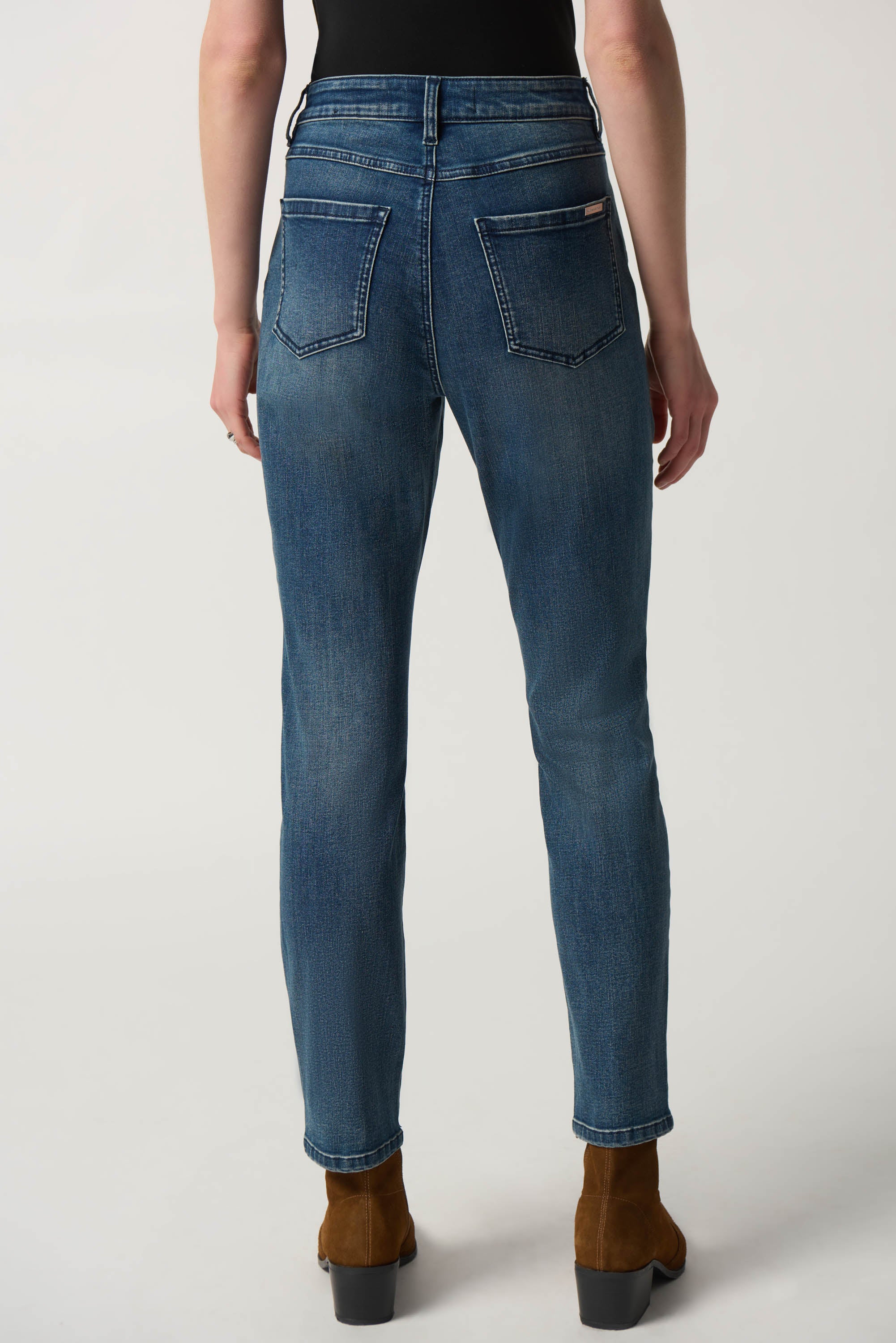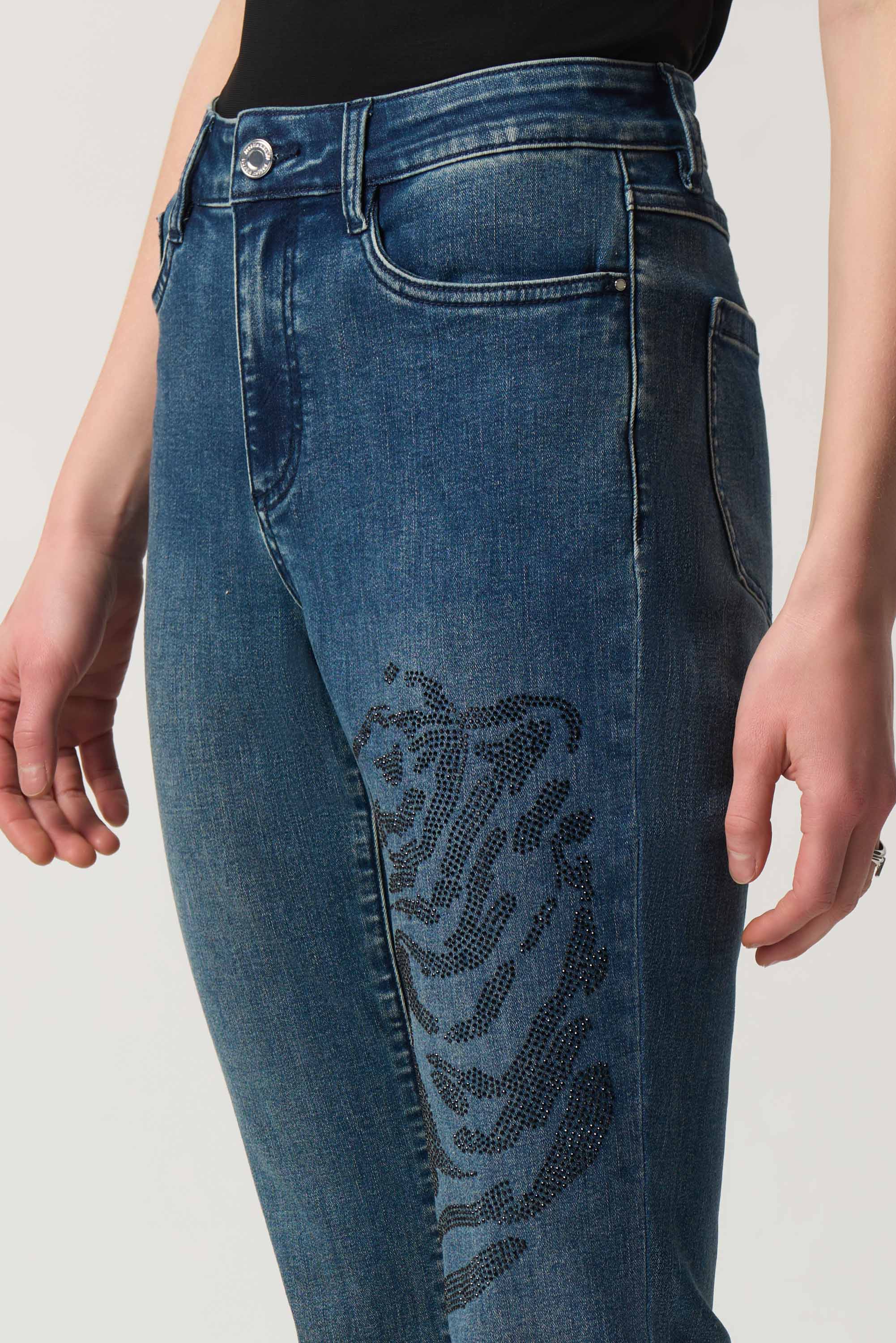 Cut in a classic slim silhouette, these jeans by Joseph Ribkoff, are crafted from a deluxe woven composition that's soft without losing its shape. They're finished with an embroidered design of a tiger in rhinestones on the left leg for an elevated touch.