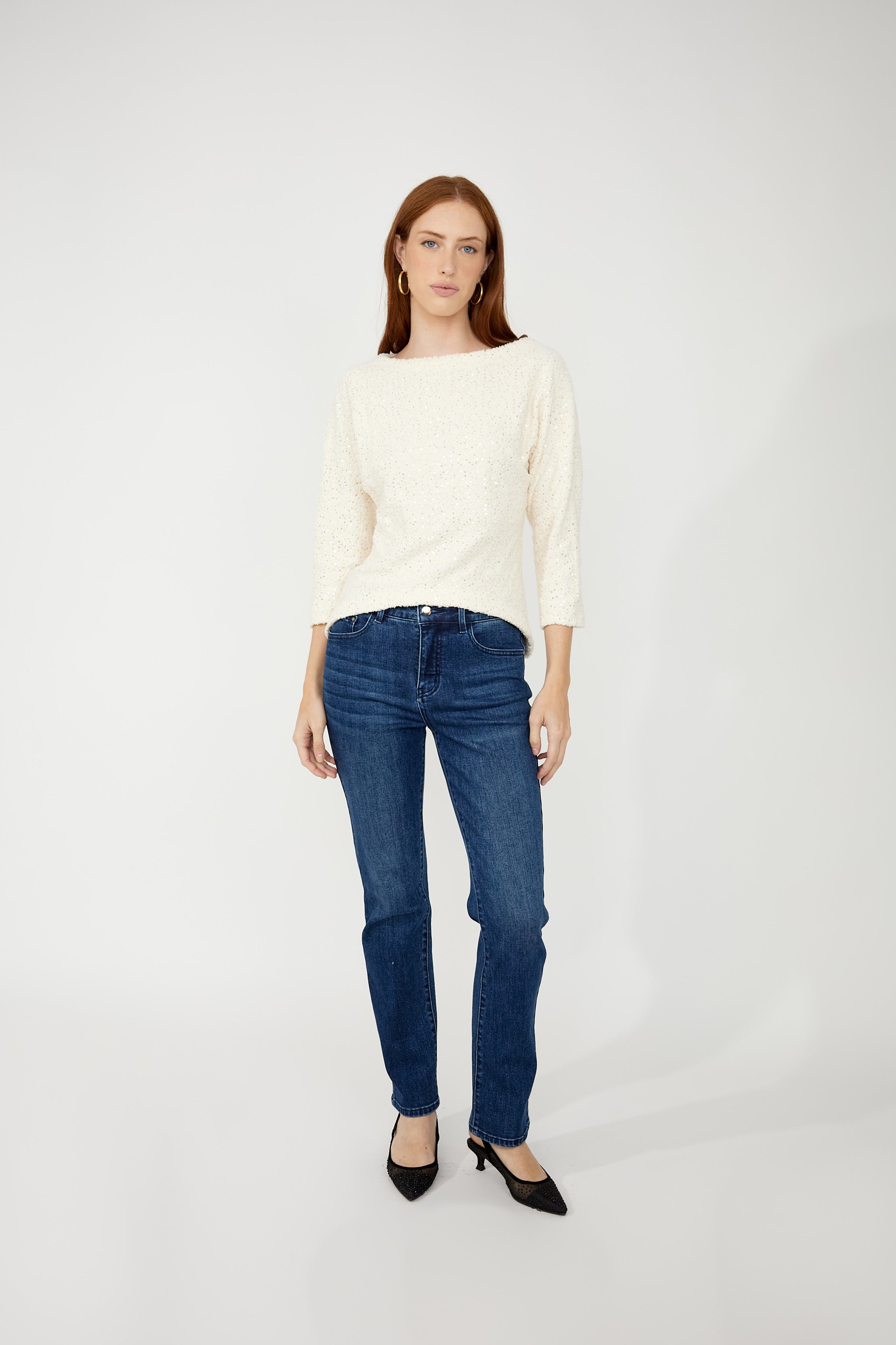 - Silky knit top in vanilla color, adorned with an elegant boat neckline that enhances the décolletage with a timeless touch.