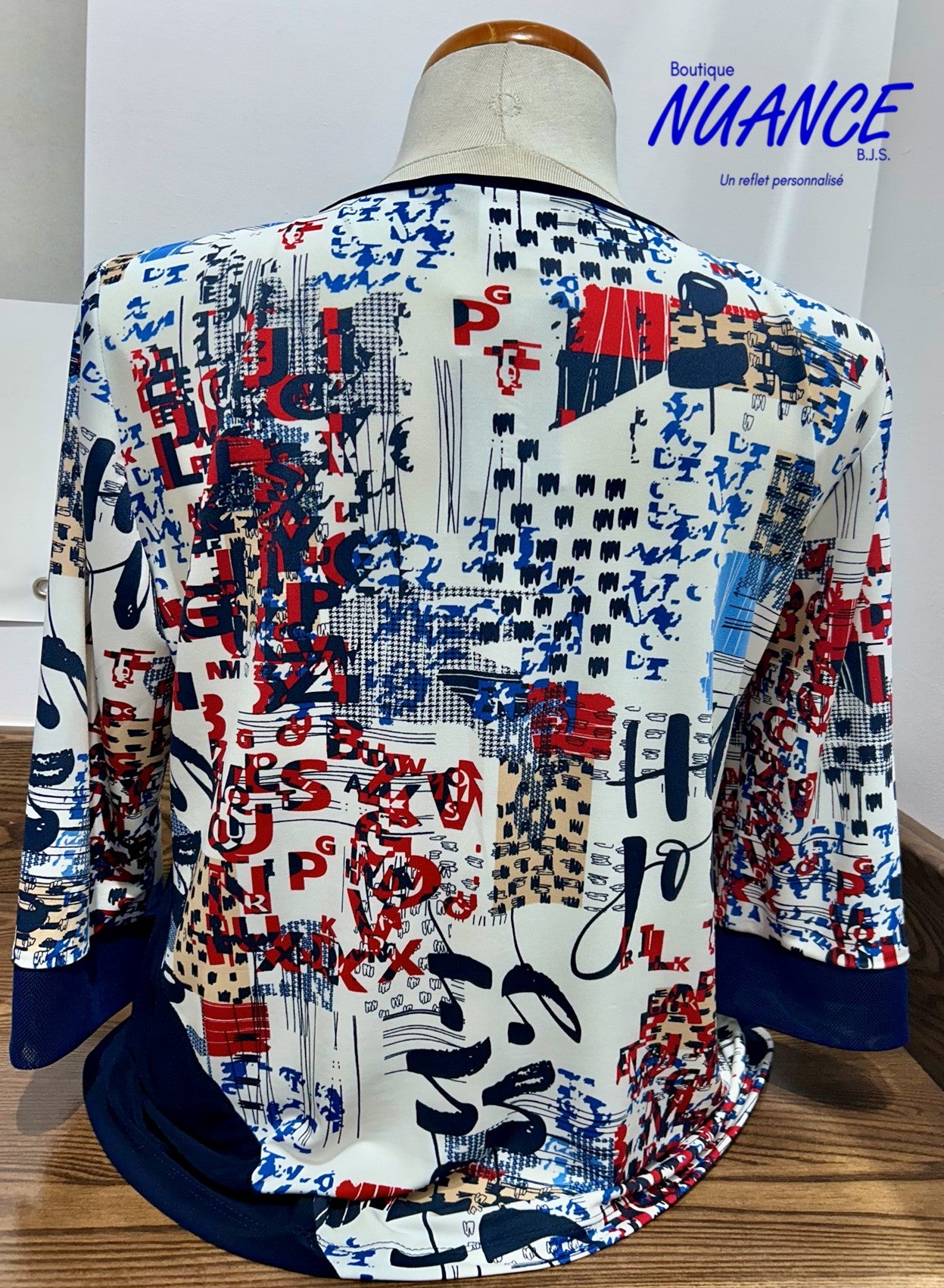 Three-quarter sleeves : Adorned with a navy canvas border, adding a structured and elegant touch.