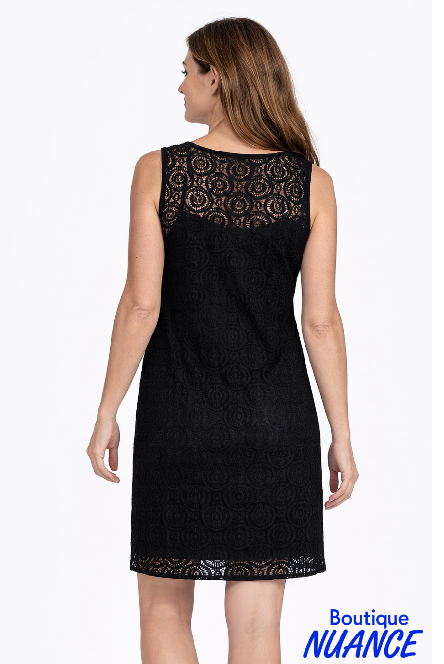 This stunning sleeveless dress captivates with its textured jacquard fabric and openwork pattern, offering a chic and delicate look. Its V-neckline flatters the neckline, while its wide straps ensure perfect comfort for everyday wear or special occasions. The straight cut creates an elegant and flowing silhouette. It features an integrated opaque lining, providing beautiful coverage while allowing the subtle pattern to shine through. A light and sophisticated dress, ideal for your summer events.