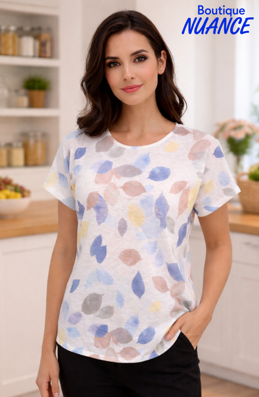 In a solid white color, it is delicately enhanced with a superb foliage pattern in shades of brown, khaki, blue, and yellow. The combination of these hues creates an elegant and luminous contrast, bringing depth and refinement to the whole.