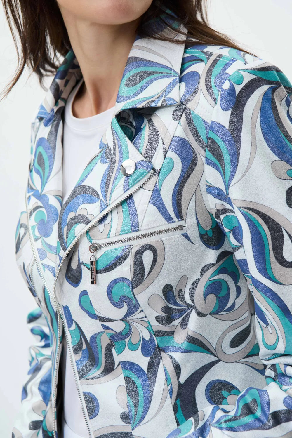 This women's jacket from Joseph Ribkoff features marine/black/grey/magenta patterns on a white background that will easily match with solid tops and bottoms. It has a notched lapel collar and a small zippered pocket at the front. Made of 90% Polyester and 10% Spandex.