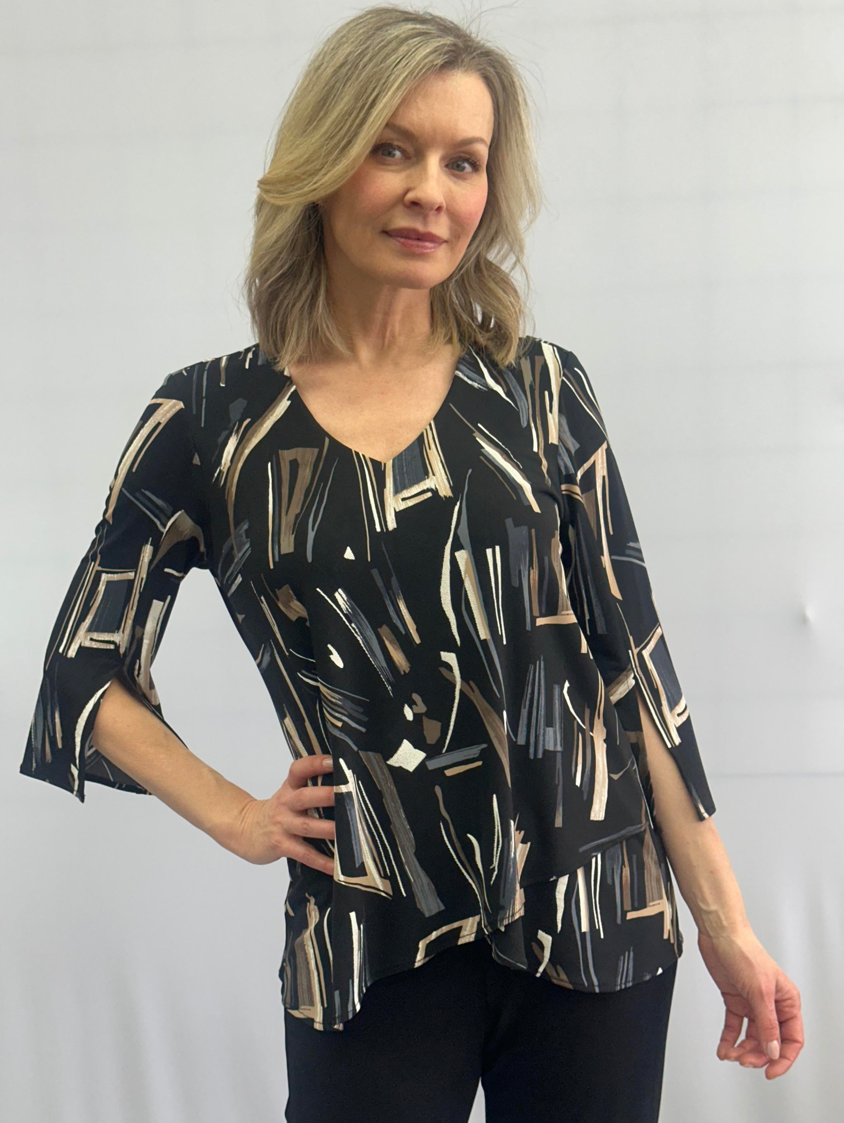 - Encolure en V arrondi élégant et manches trois-quarts ornées de fentes en V intérieures pour un effet gracieux.