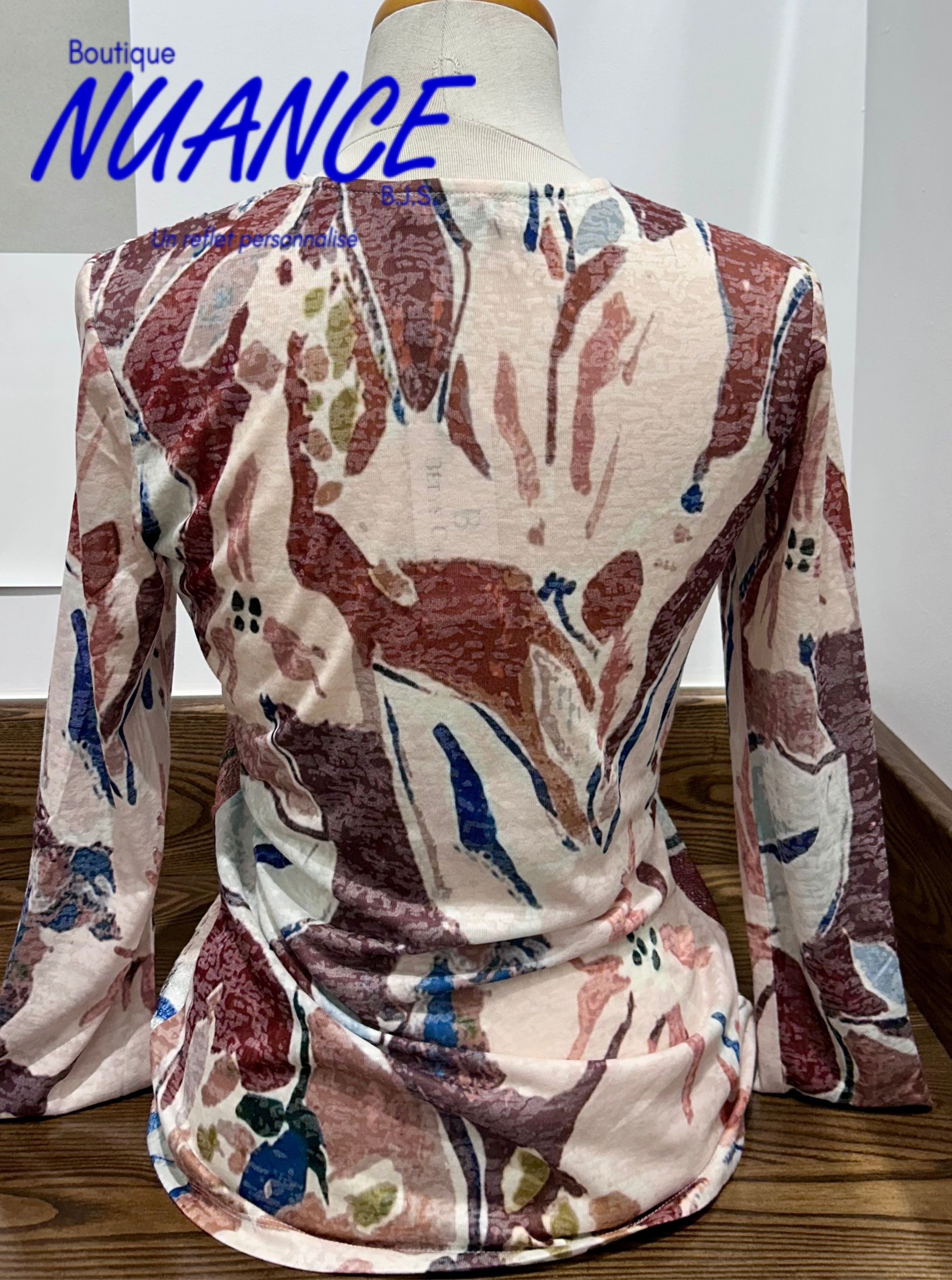 - Type : Haut à manches longues avec encolure ronde, dans une teinte beige multi, offrant une allure raffinée.
