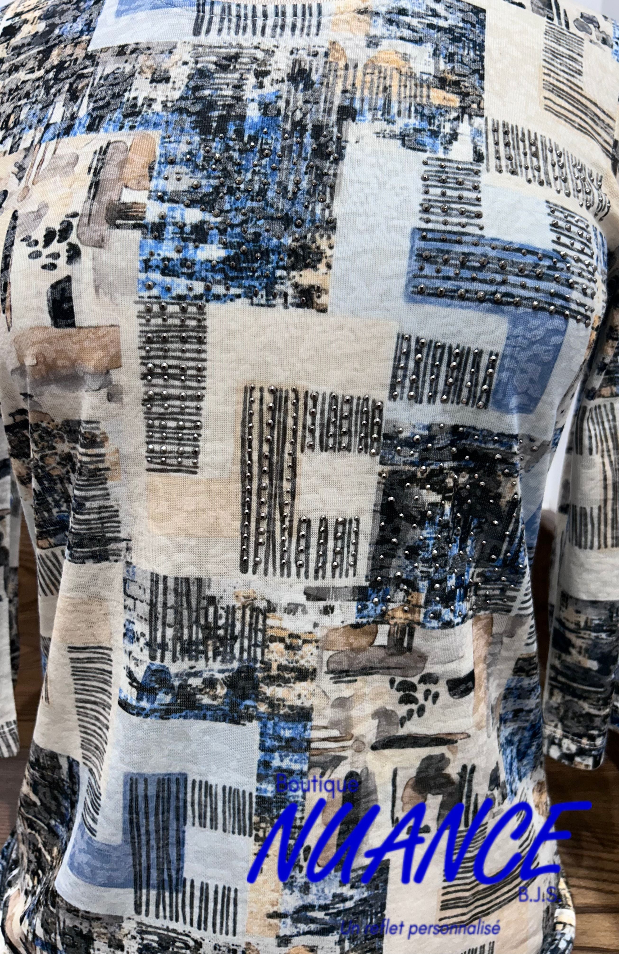 - Design : Motifs graphiques à effet collage ou assemblage de formes, dans des tons beige, bleu, noir, sable et gris.