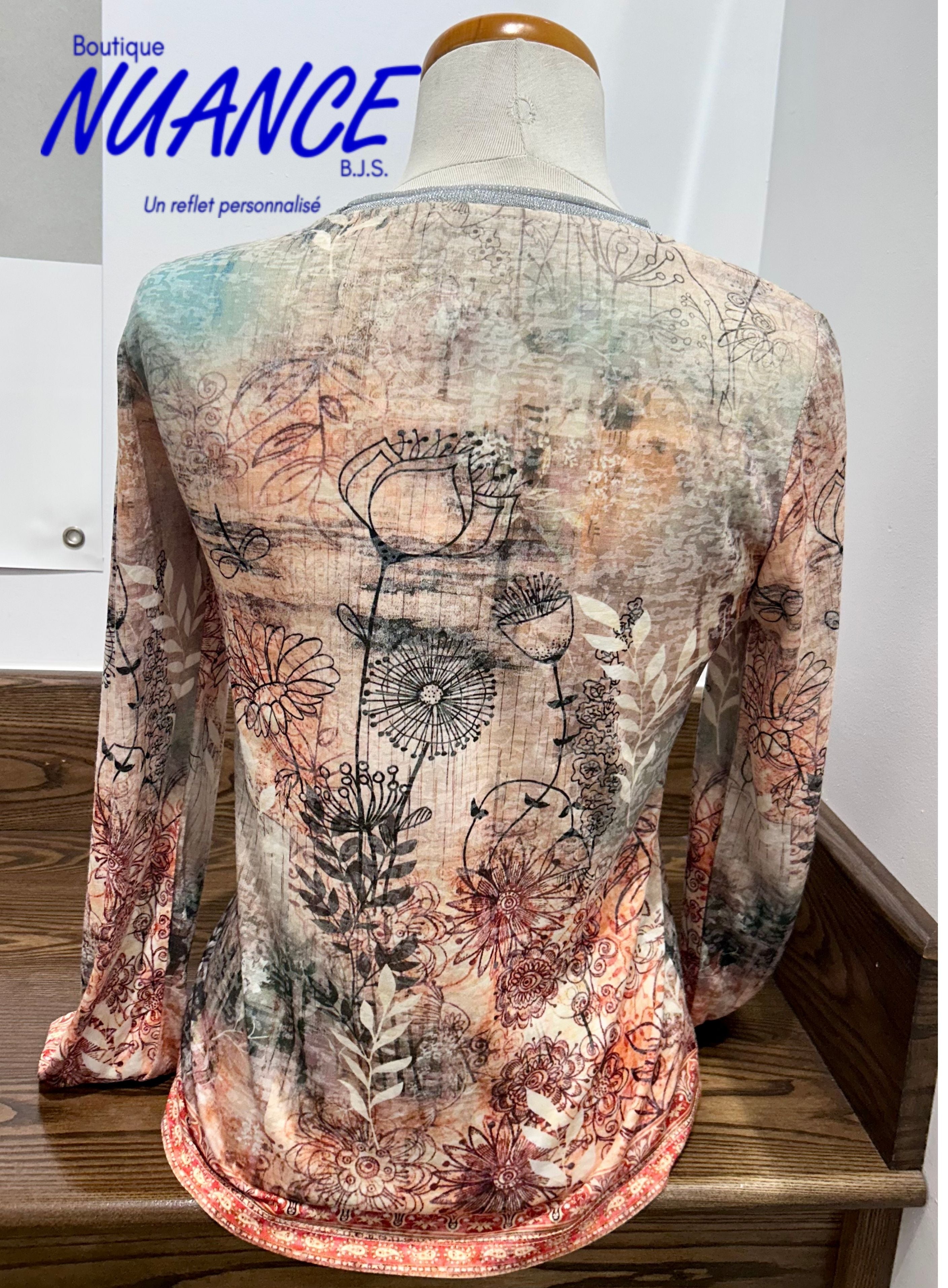 - Palette : Tons terreux élégants mêlant beige, pêche, saumon, brun, gris et touches subtiles de vert pâle.