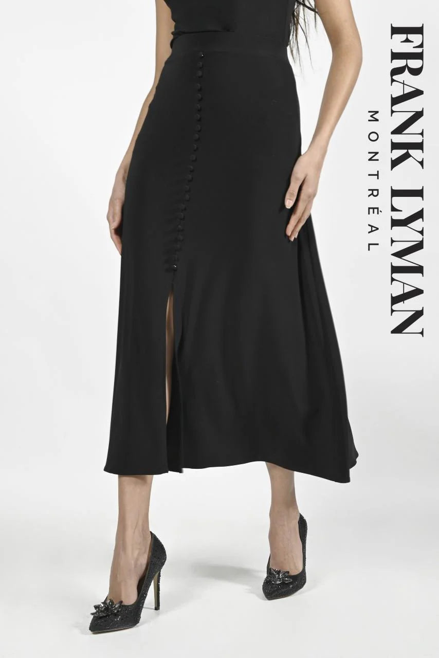 Plongez dans le raffinement absolu avec Frank Lyman, une marque montréalaise emblématique qui célèbre la féminité avec des créations haut de gamme ! Cette jupe noir profond est une pièce maîtresse qui allie simplicité sophistiquée et élégance fluide, parfaite pour sublimer vos soirées spéciales avec une allure inoubliable.