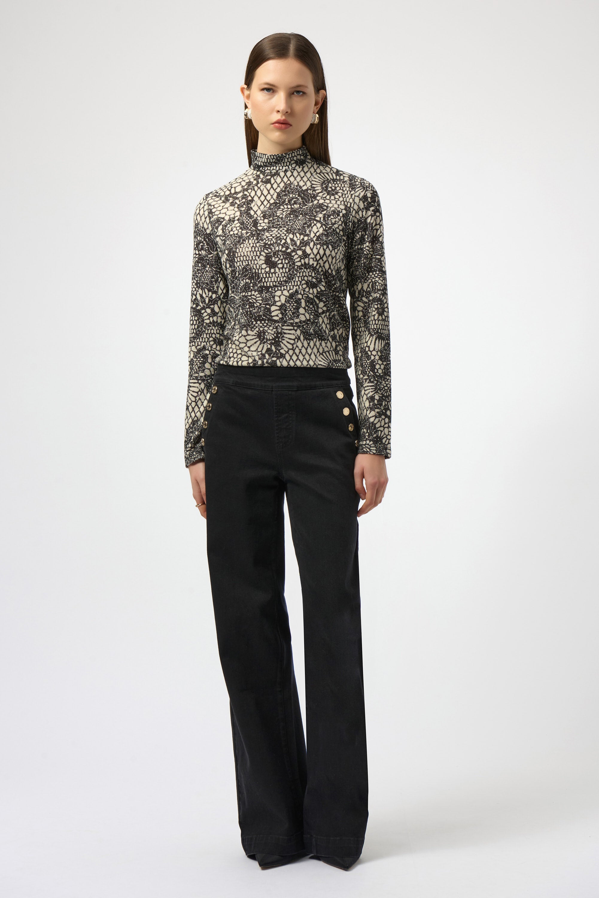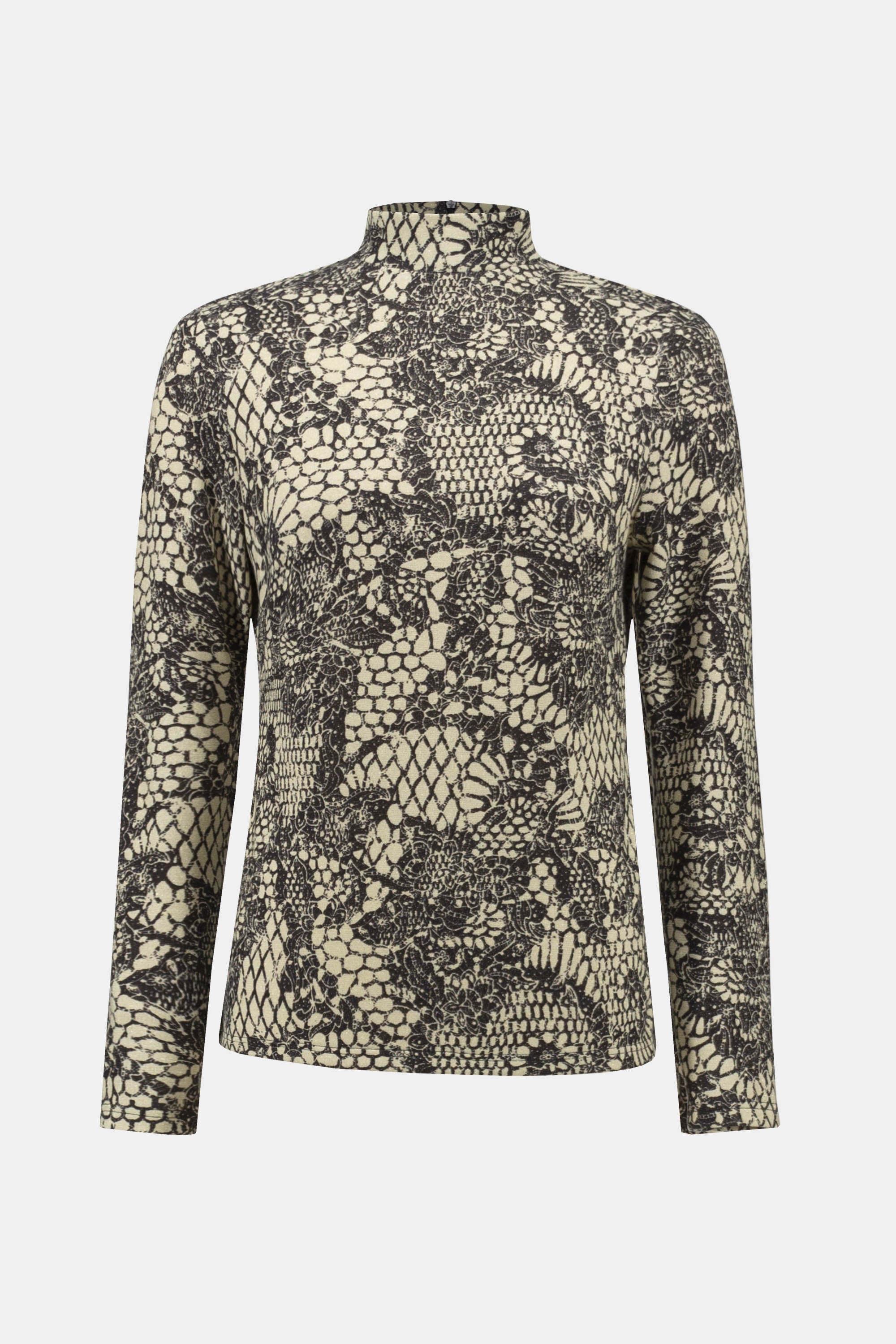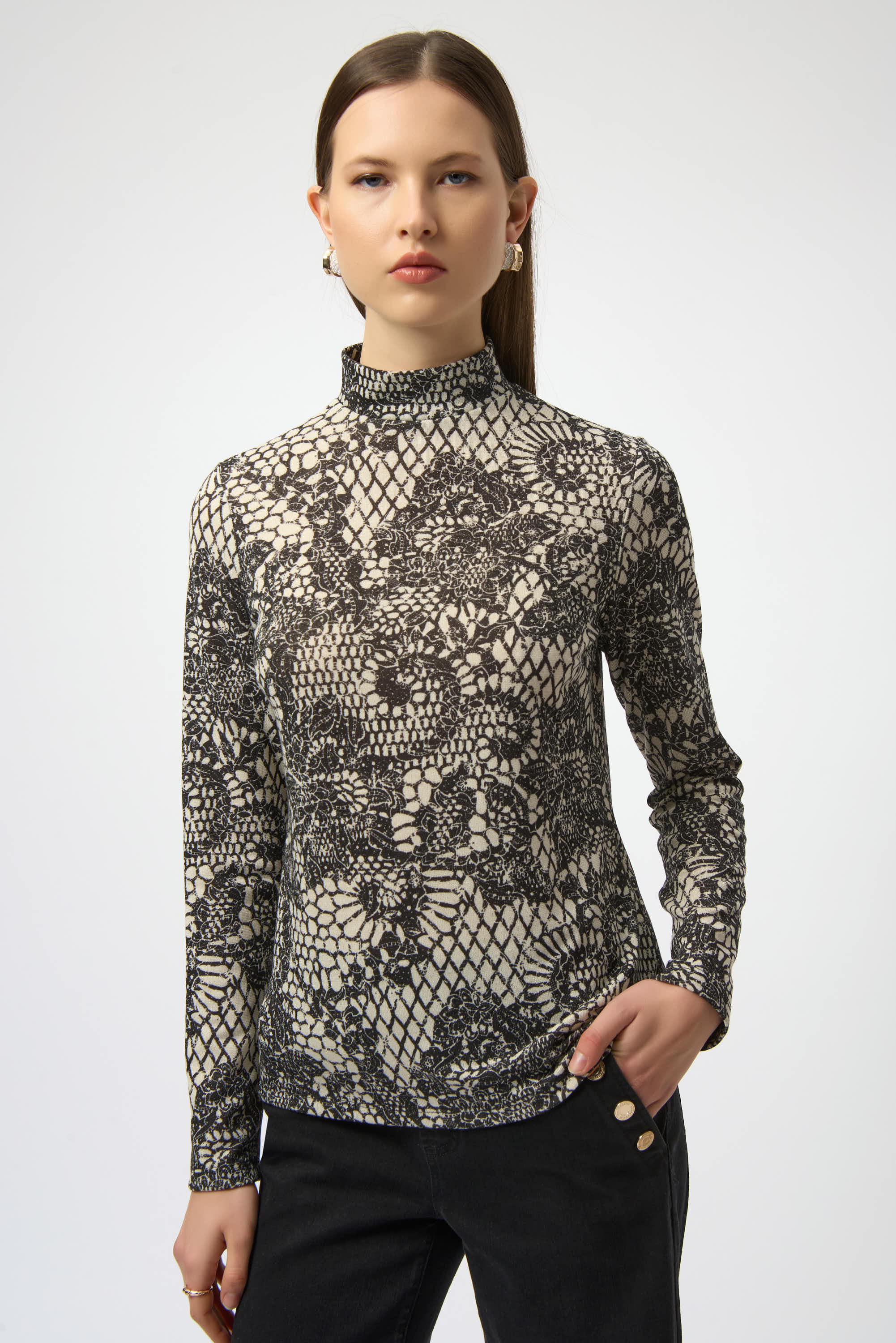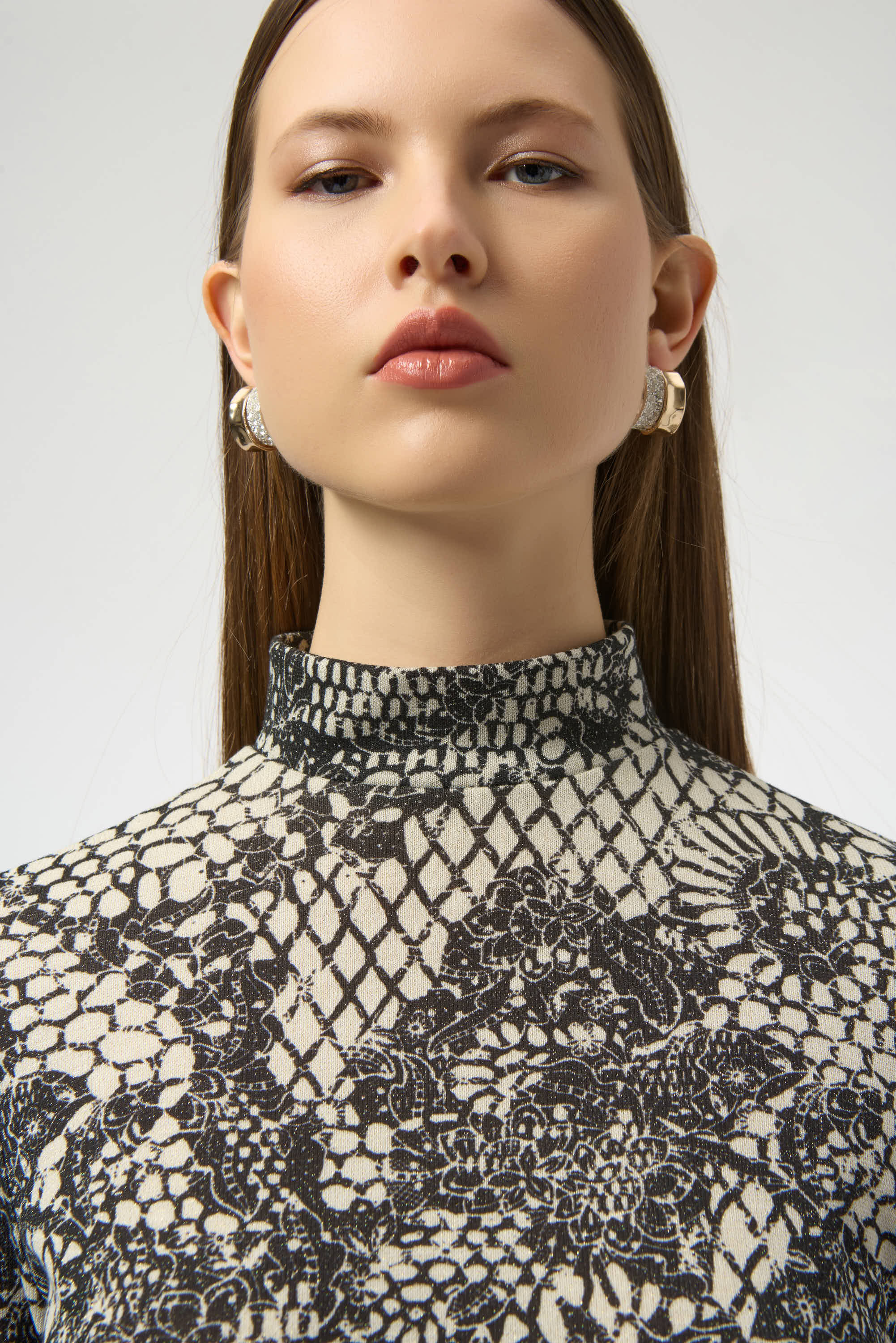 Joseph Ribkoff, icône de la mode montréalaise, crée des pièces audacieuses pour la femme confiante et élégante. Ce haut ajusté en tricot, conçu à Montréal, dans un blanc hivernal orné de motifs de dentelle noirs, allie confort sophistiqué et style glamour pour un look qui illumine chaque occasion.