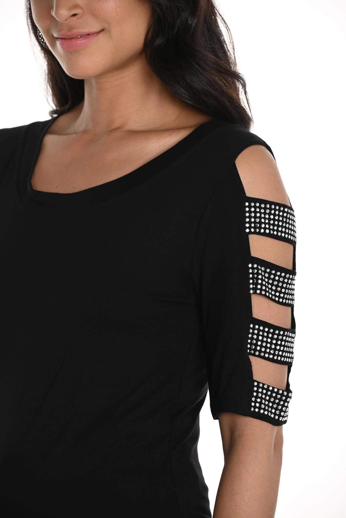 Une manche ornée de superbes bandes de diamants étincelants, créant un jeu de transparence et de lumière alternant peau et éclat, pour un rendu luxueux et audacieux.
