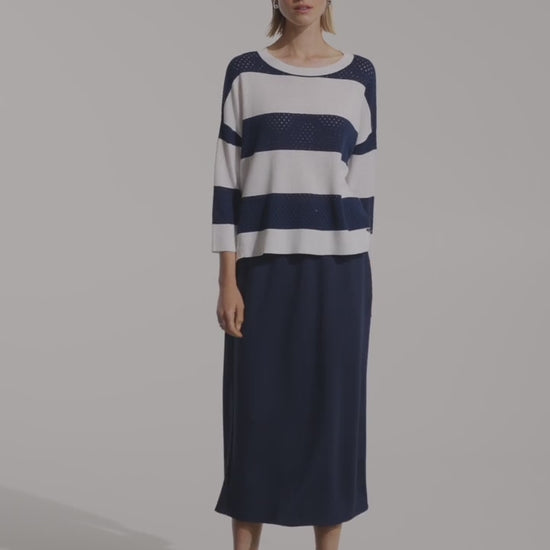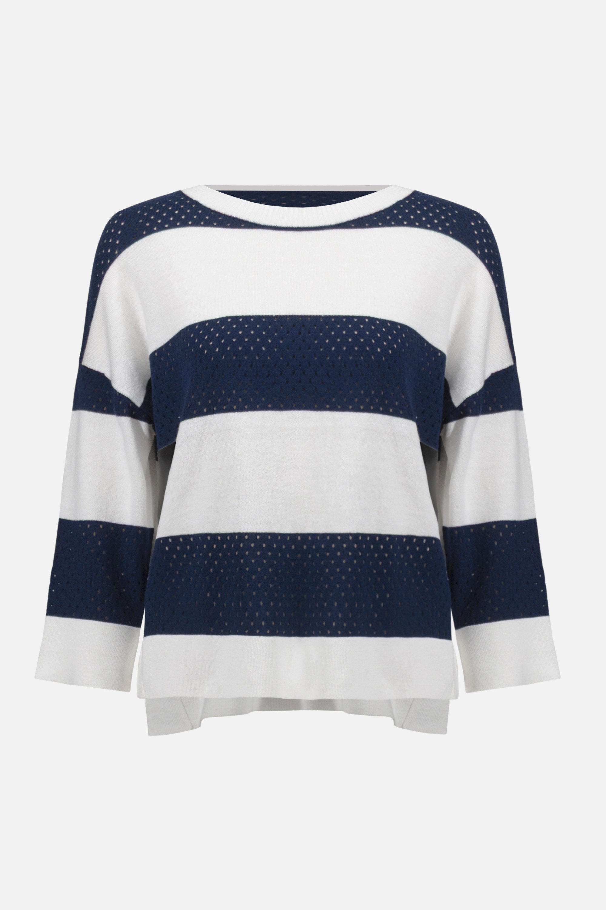 Les rayures marines présentent un délicat motif ajouré en pointelle, créant un effet de texture raffiné et respirant.