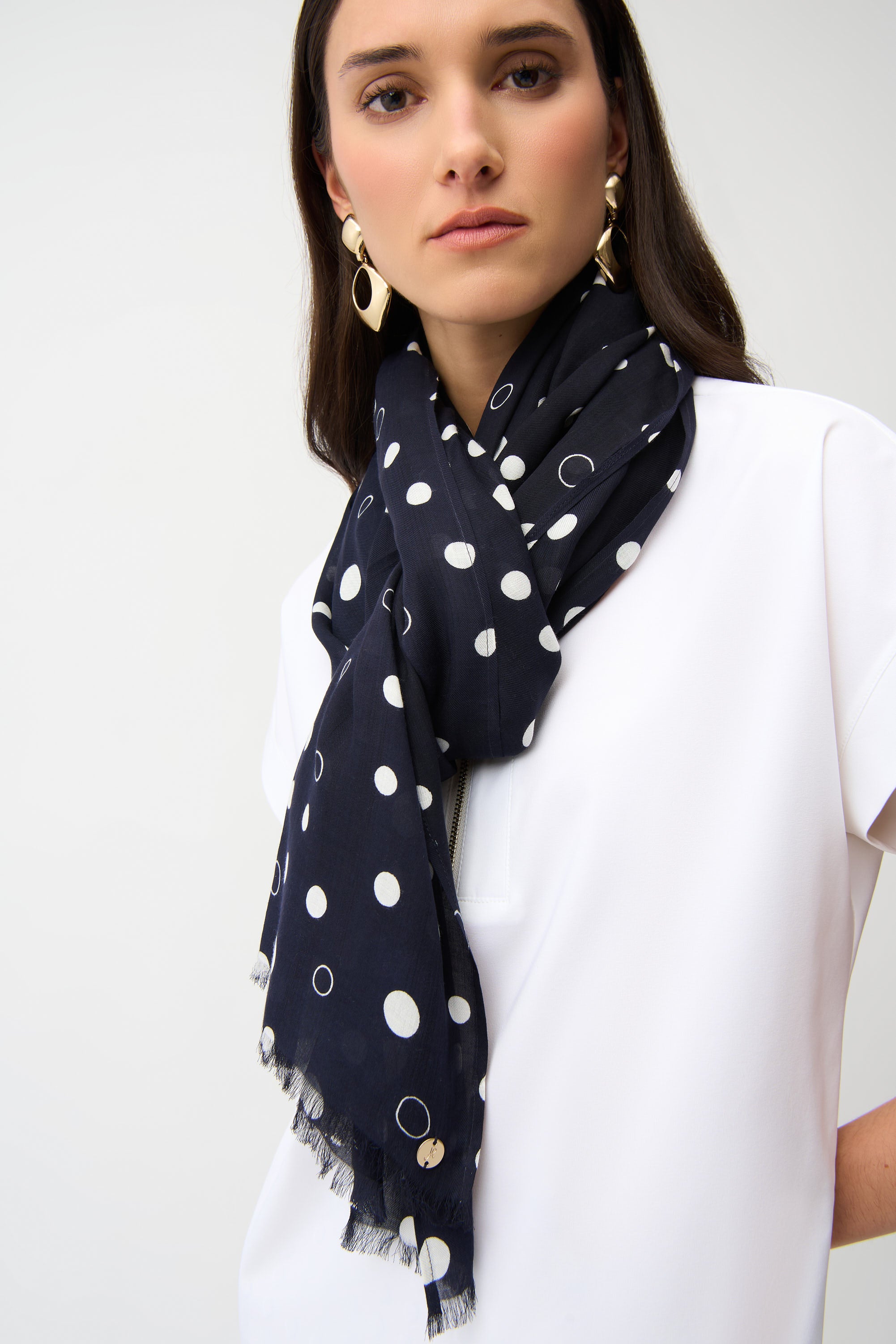 Conçu par la prestigieuse marque Joseph Ribkoff, ce foulard reflète le savoir-faire canadien : élégance, finesse et qualité exceptionnelle. Chaque détail — de l’imprimé à pois aux accents métalliques Signature JR — illustre la passion de la marque pour les accessoires raffinés et polyvalents.