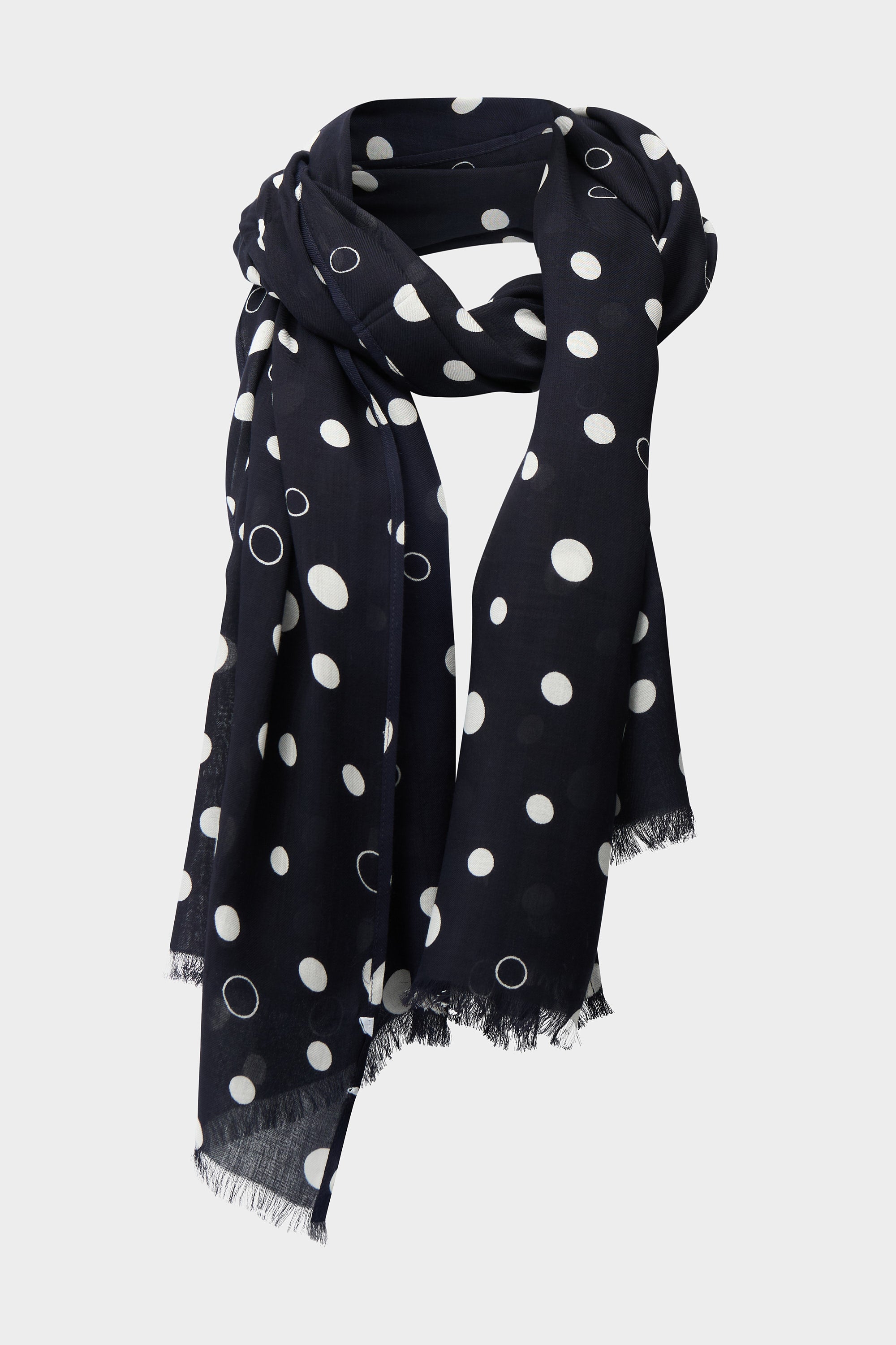 Légère et ludique, ce foulard en modal présente un imprimé à pois classique, des bords à franges douces et des accents de pièces métalliques Signature JR.