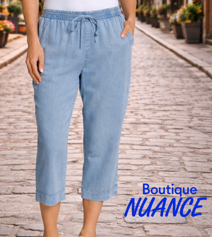 Ce capri à jambe droite, dans une teinte denim clair douce et lumineuse, incarne parfaitement le confort estival avec une touche d’élégance décontractée. Sa taille élastique plissée, munie d’un cordon de serrage, assure un ajustement optimal tout en offrant une allure moderne et relax.
