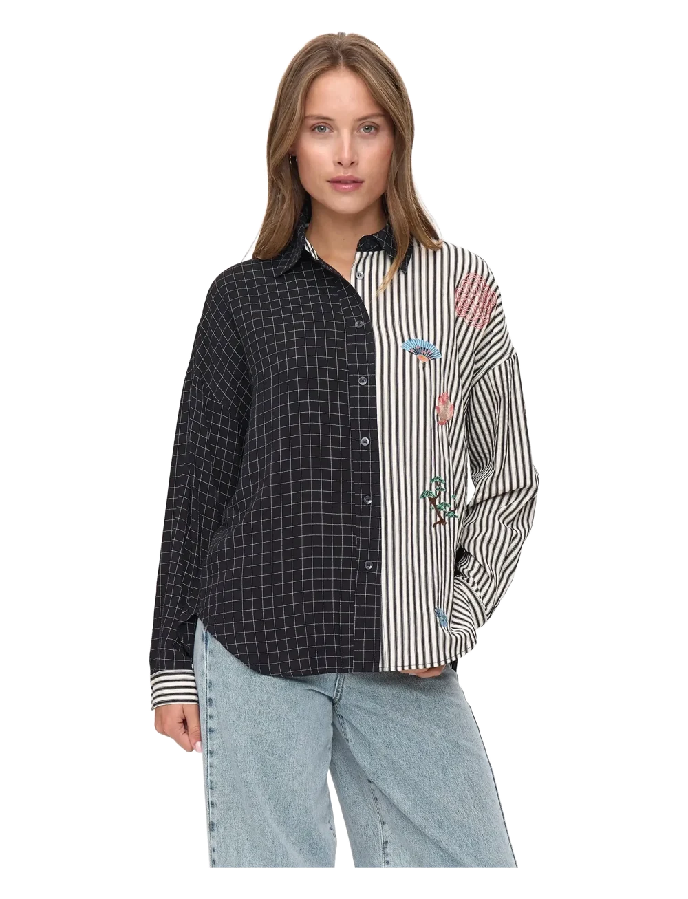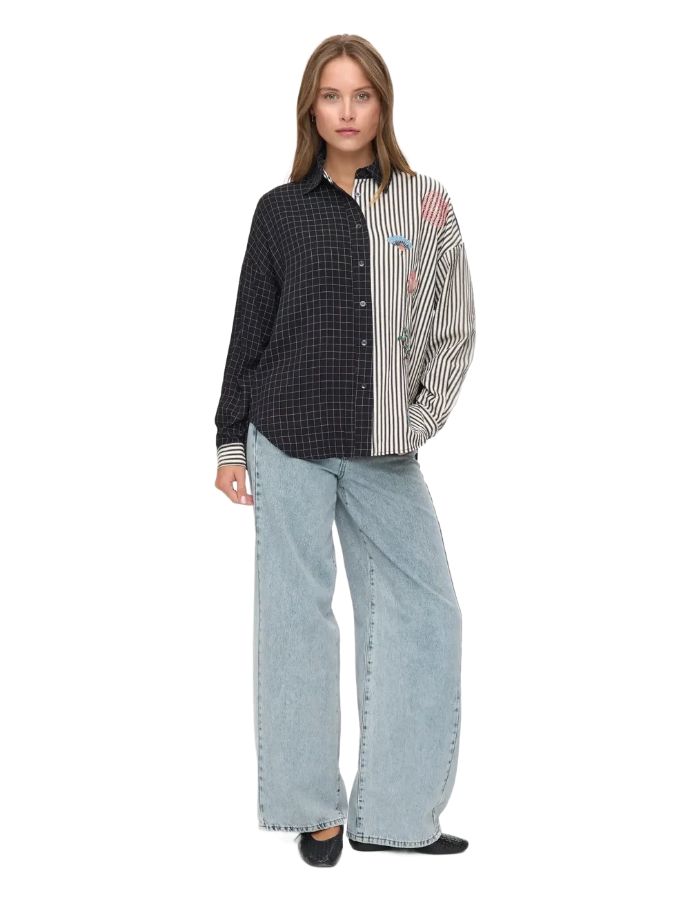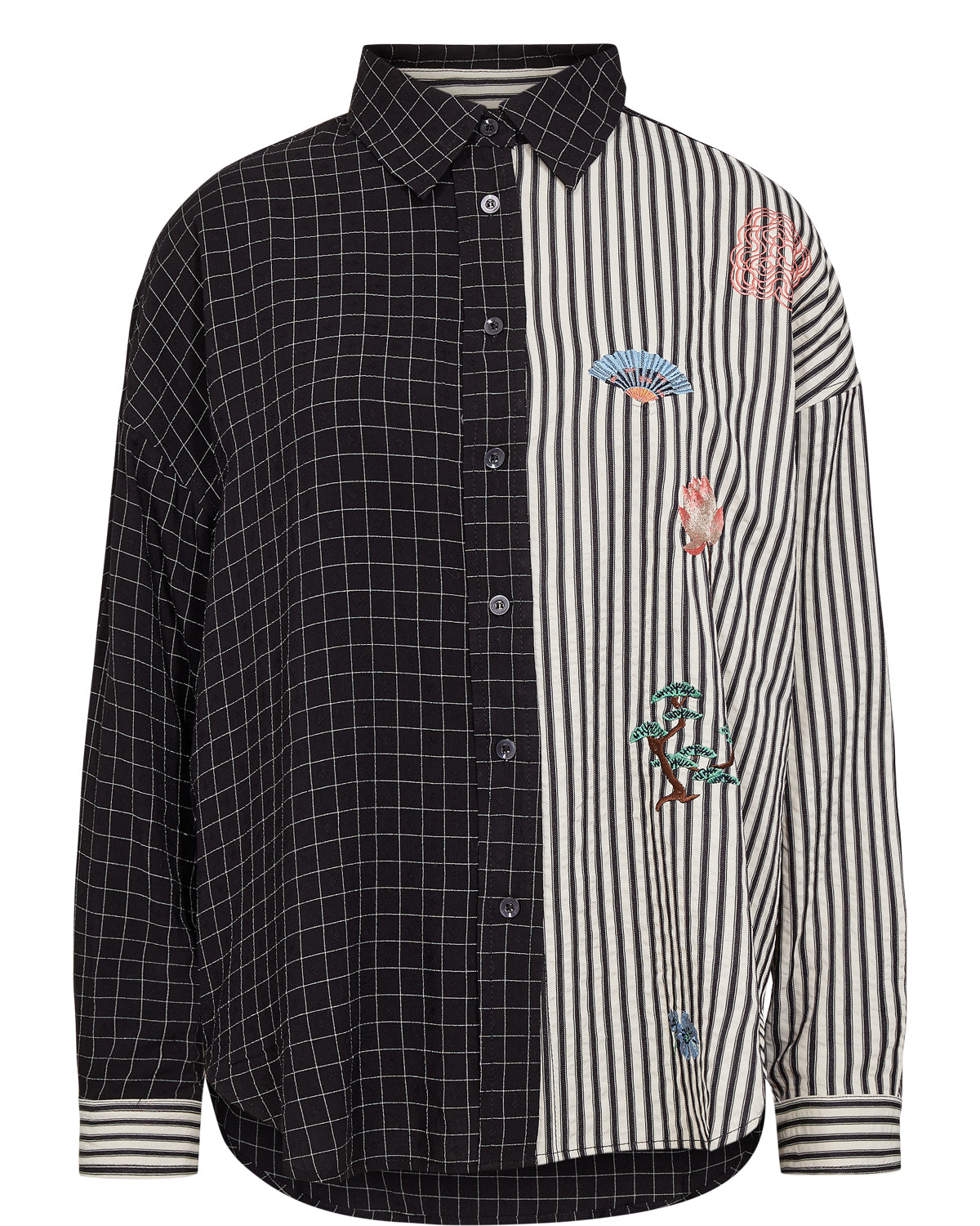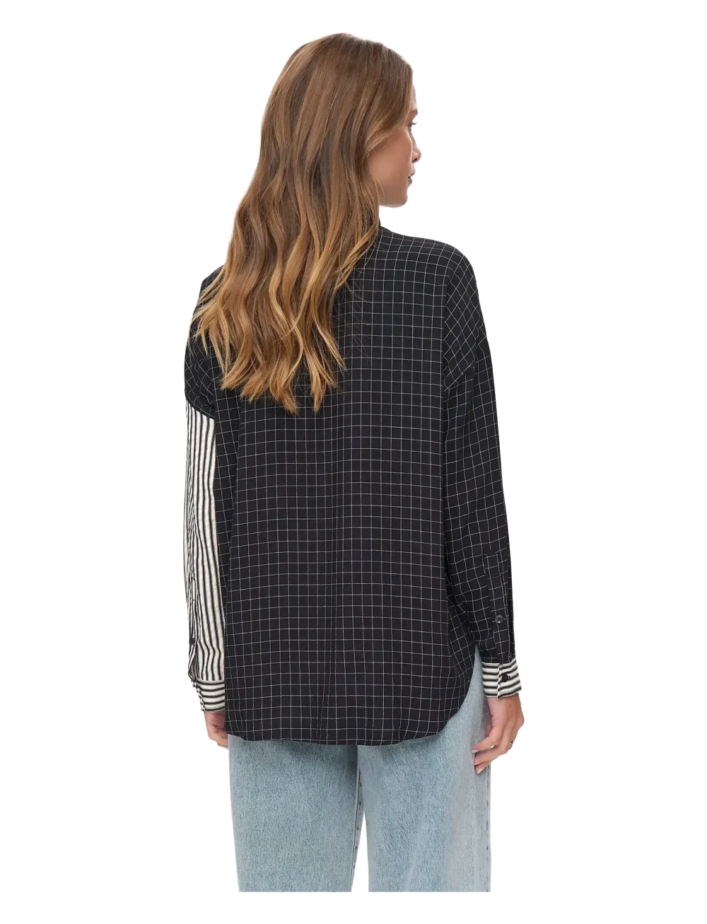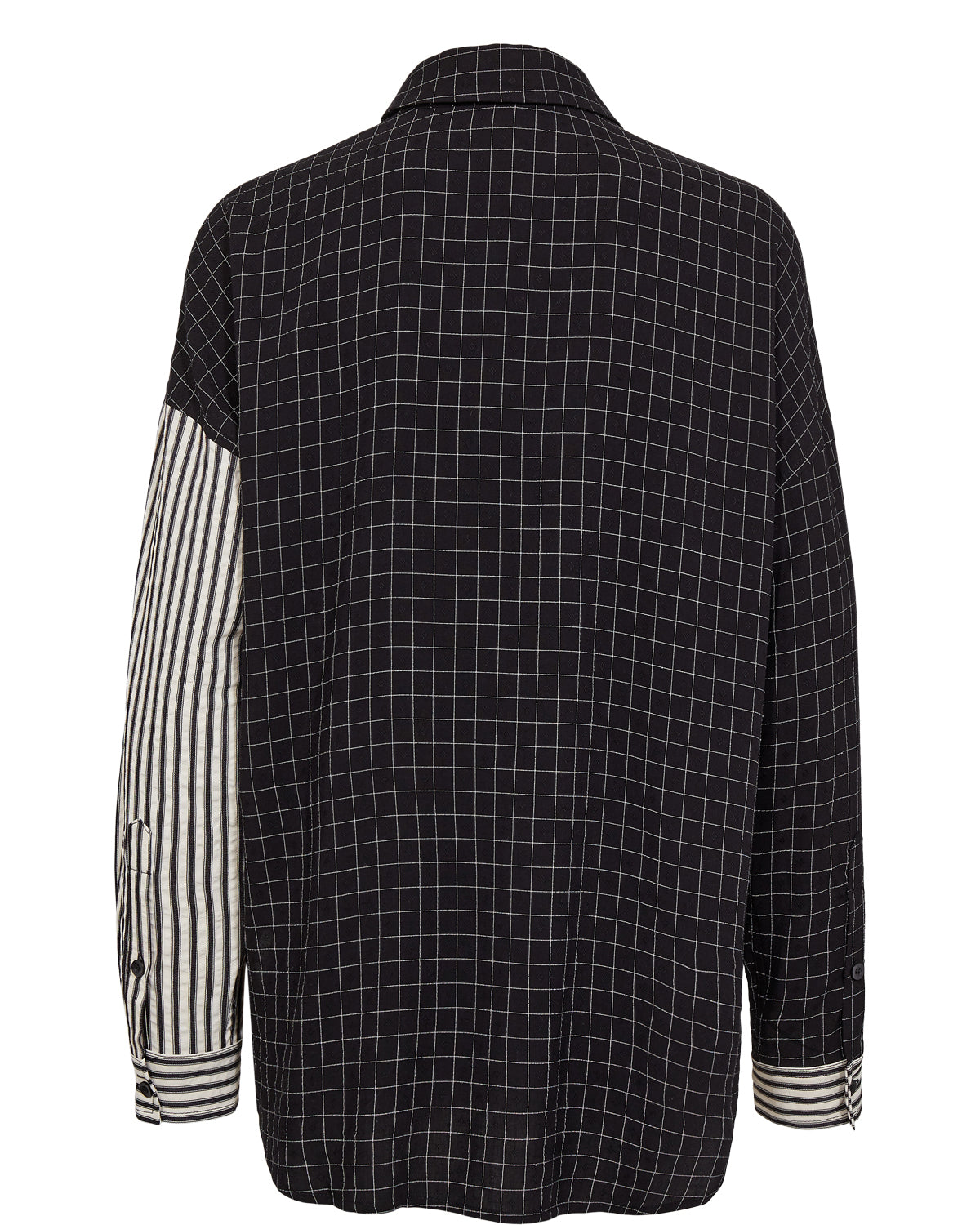 Dos du chemisier intégralement noir à carreaux fins blancs, avec une manche contrastante du côté rayé pour une finition originale et équilibrée.