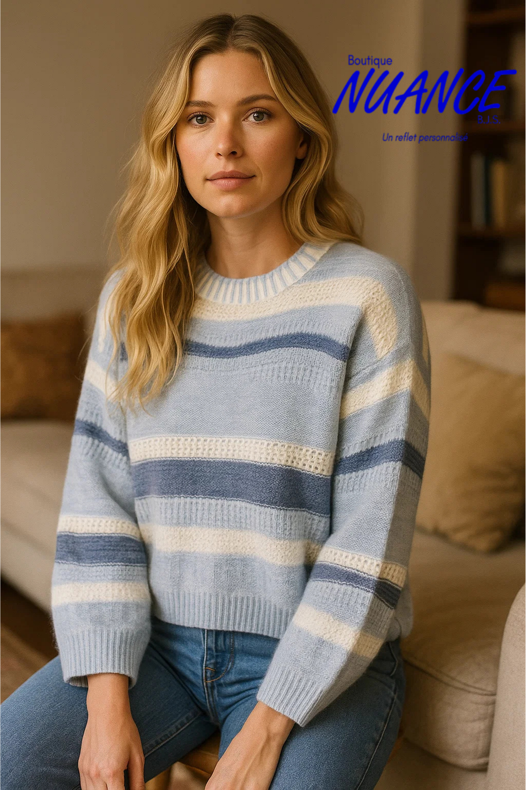 Bas du chandail : bordure côtelée assurant une ligne nette et équilibrée.