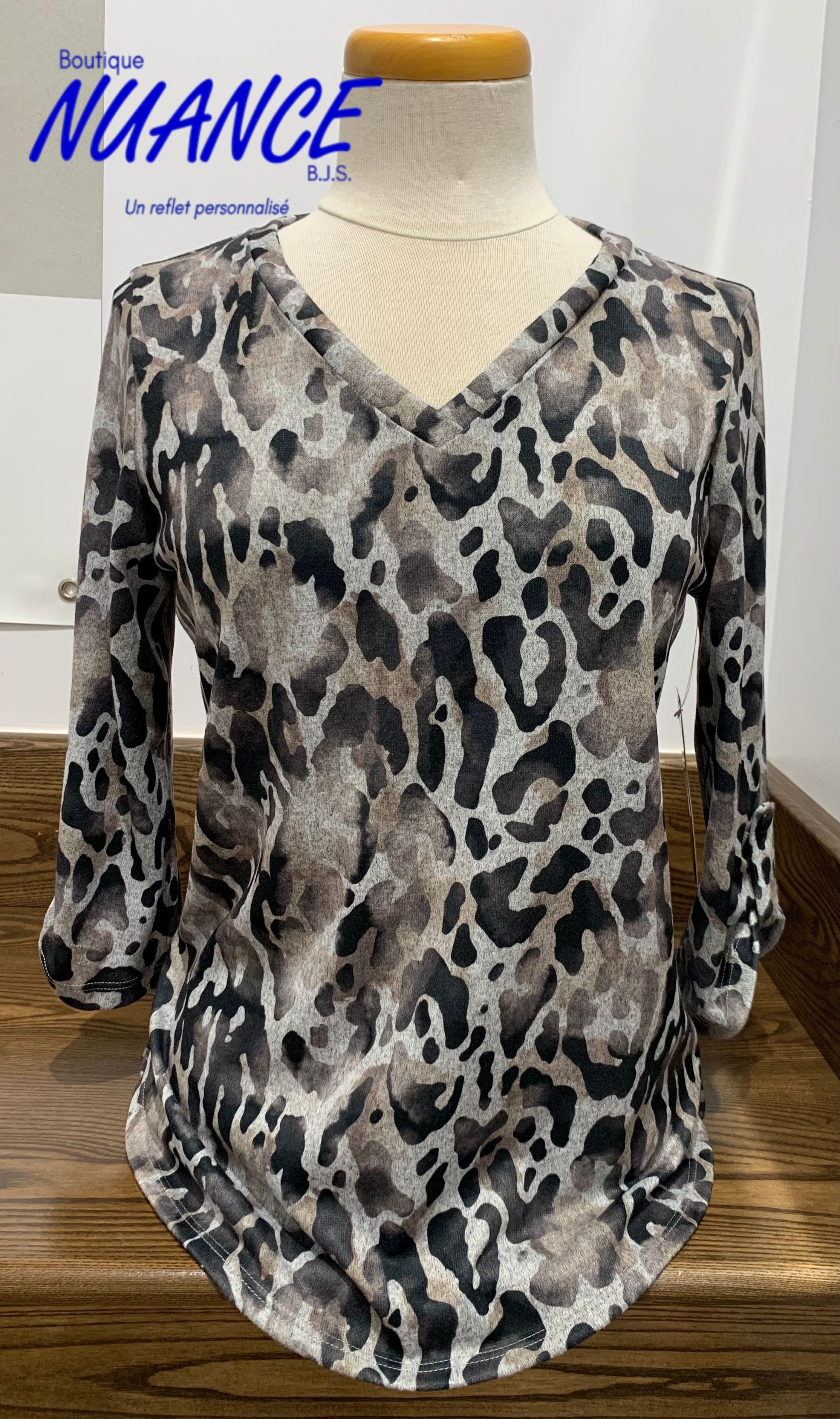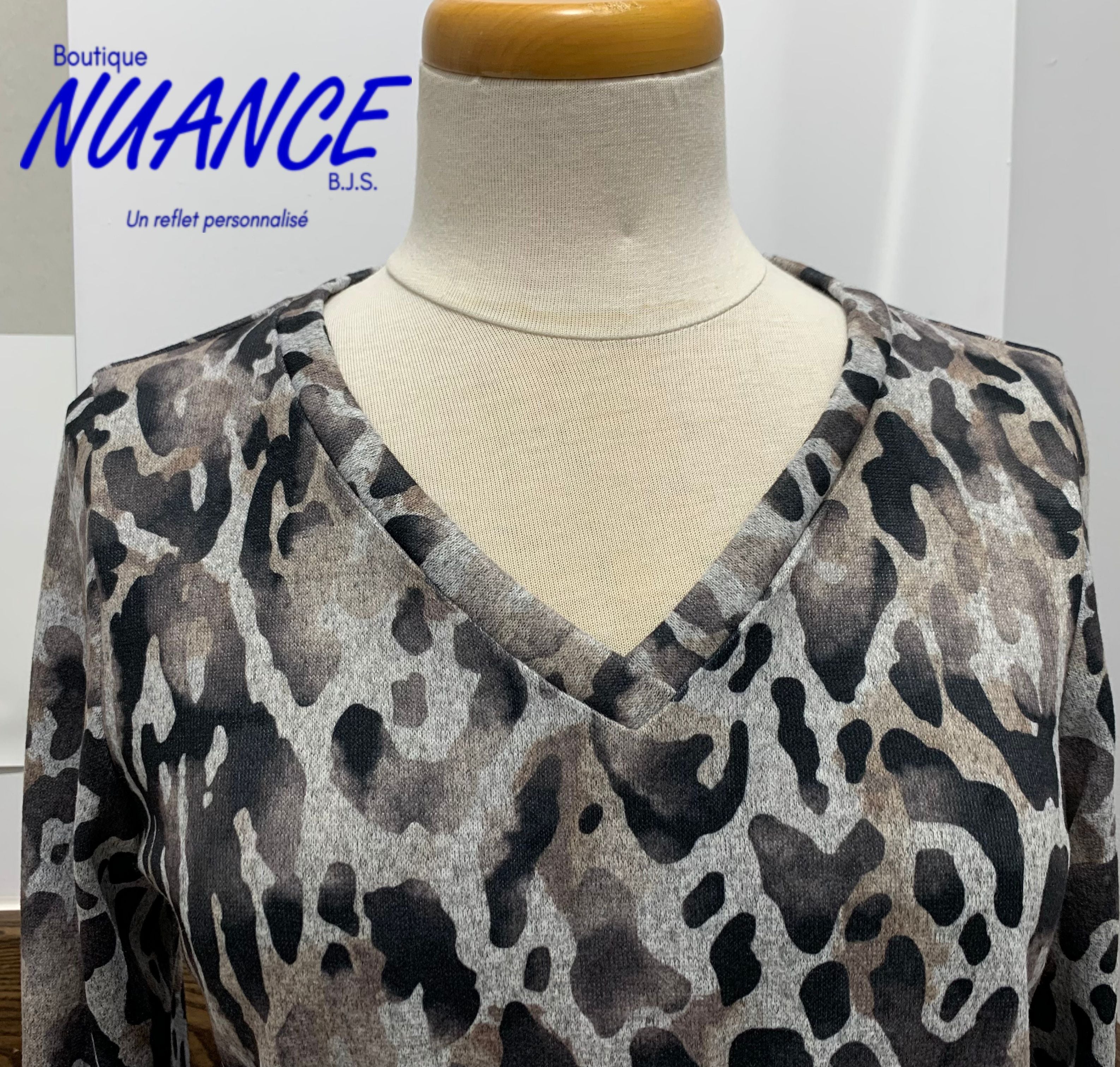 Premier haut : Base grise ornée d’un motif animalier inspiré du guépard, avec des taches de brun pâle et noir saisissant s’entrecroisant, couvrant l’ensemble du chandail. Le bas est arrondi .