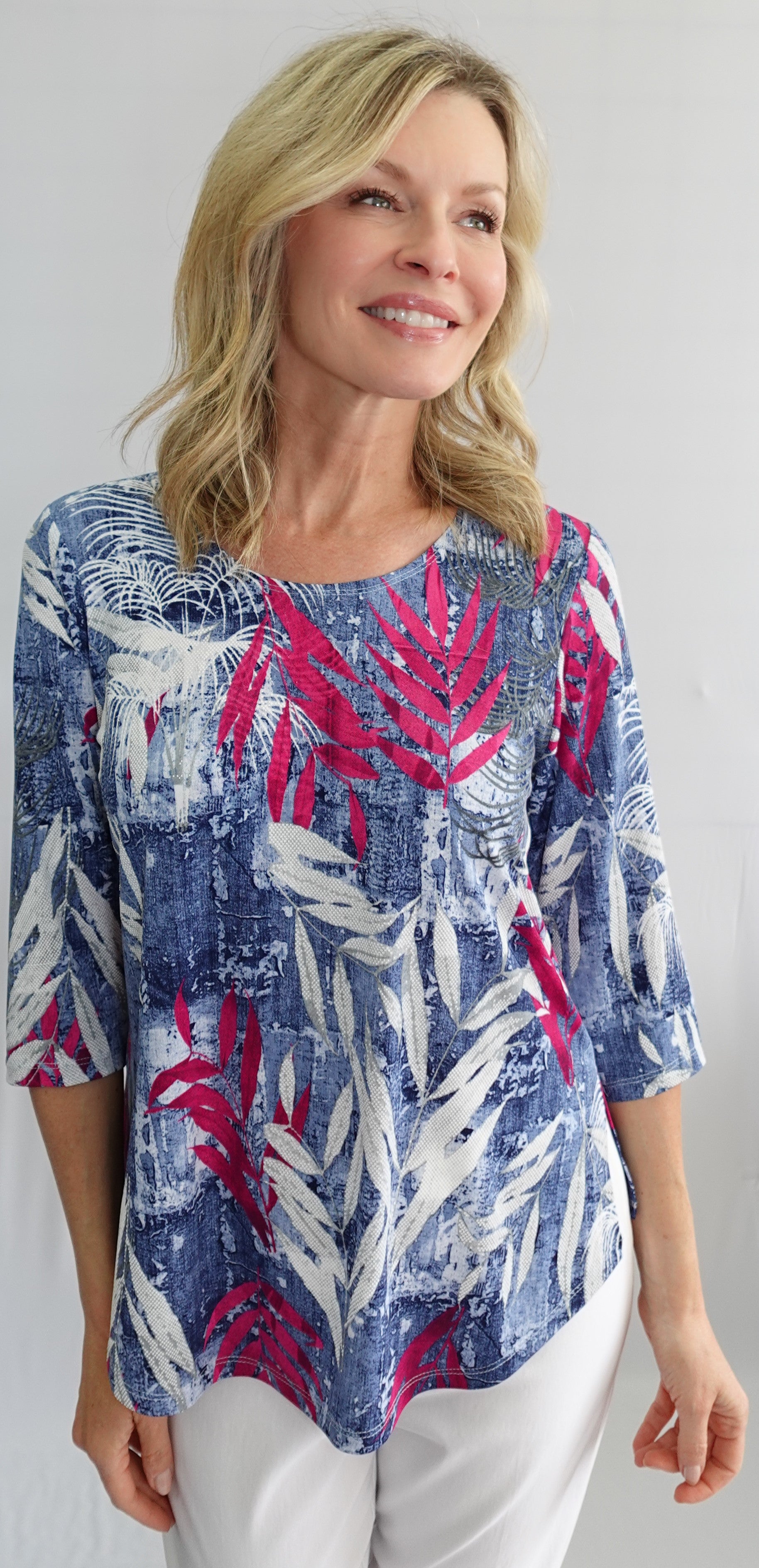 - Motifs de feuillages : Une touche naturelle et féminine, dans des tons de bleu jeans, blanc et fuchsia pour un effet visuel éclatant.