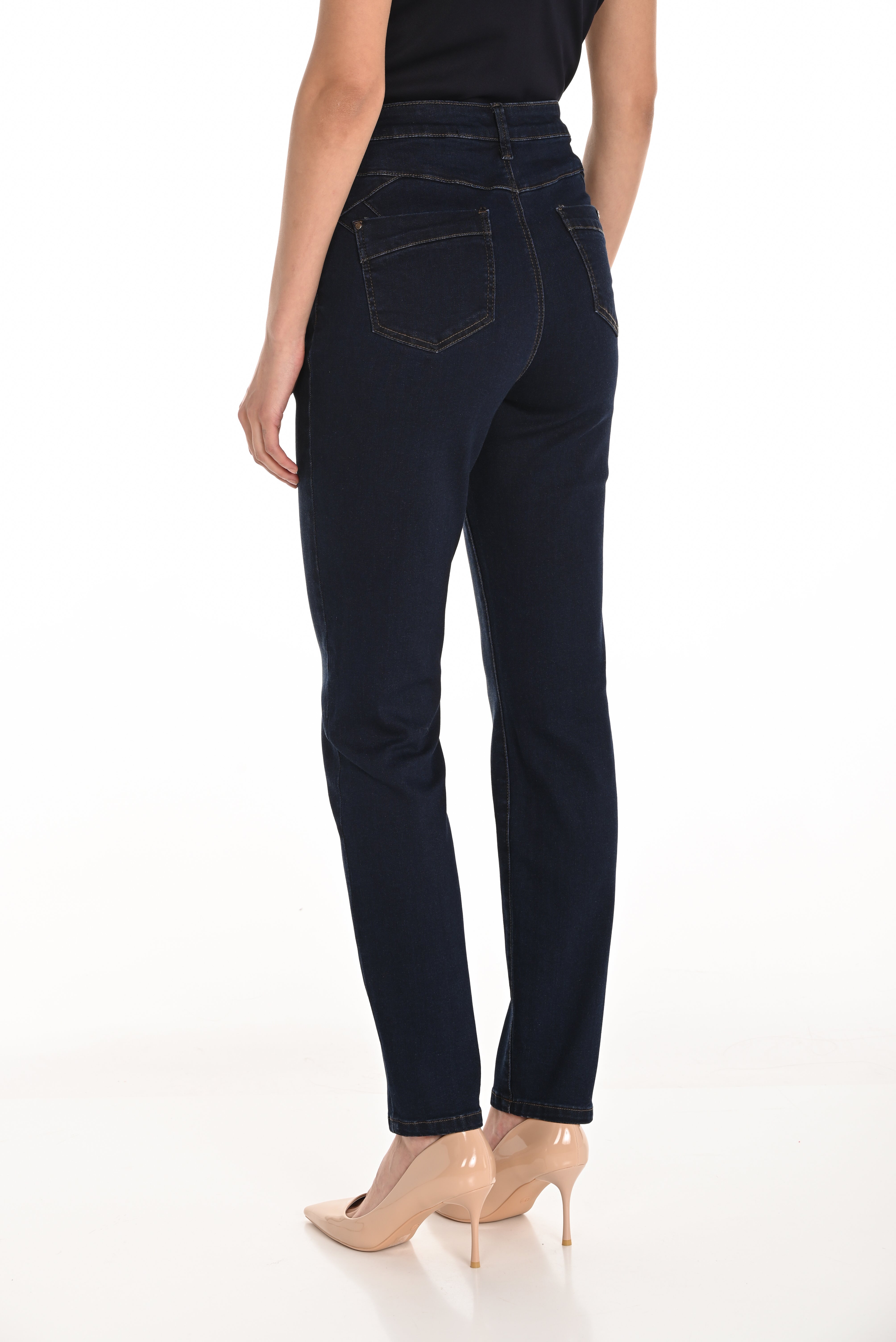 Teinte Bleu Foncé : Une couleur riche et profonde qui évoque une élégance intemporelle, rehaussée par de subtils effets délavés sur les cuisses.