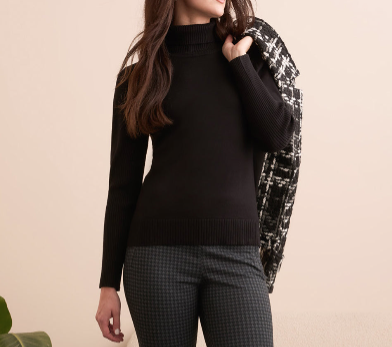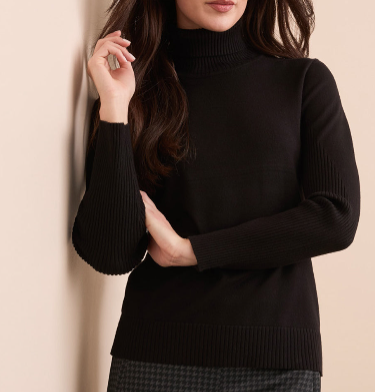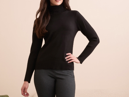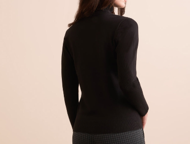 Magnifique haut d’un noir intemporel, à manches longues et doté d’un col roulé, offrant une allure sophistiquée et chaleureuse.
