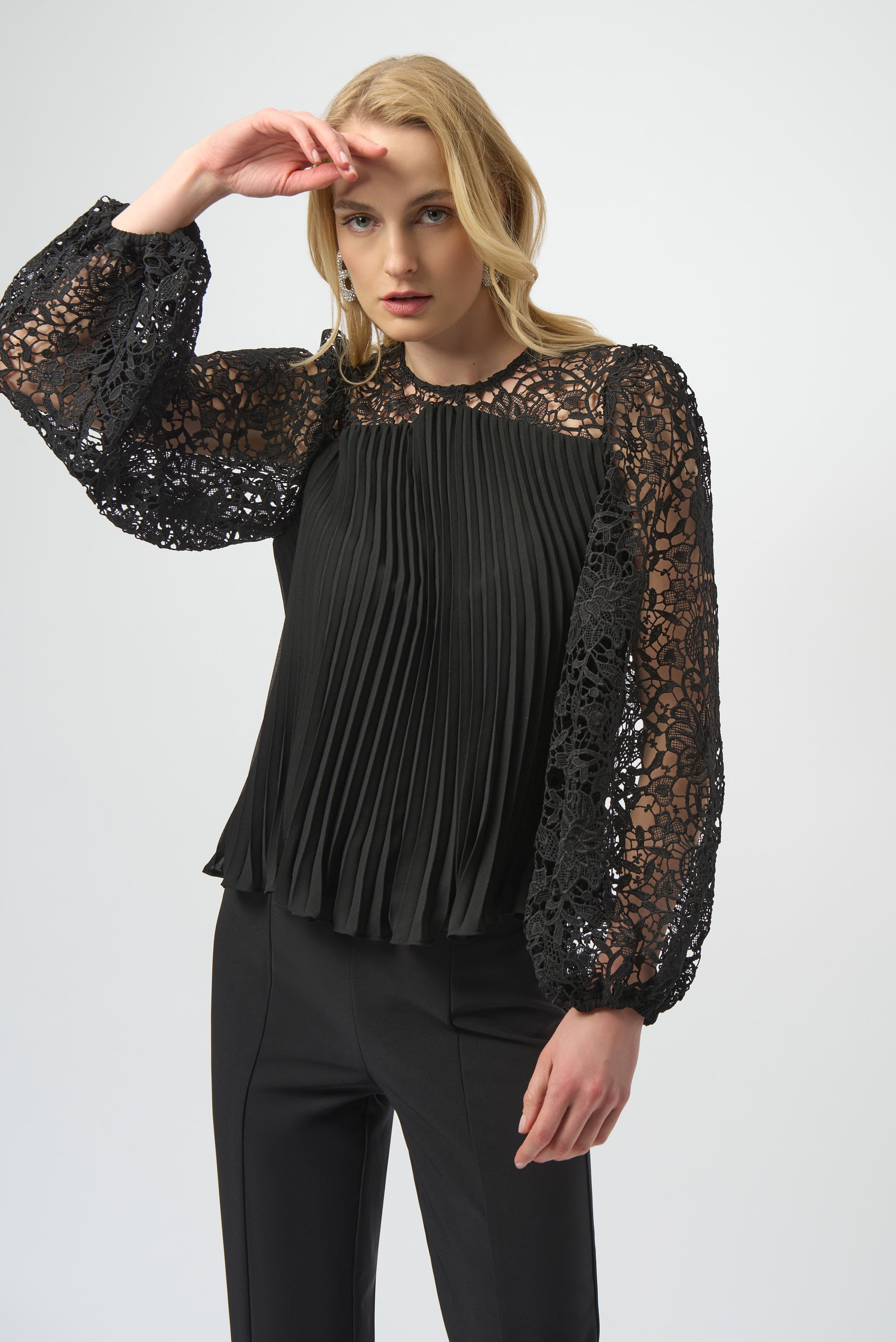 Joseph Ribkoff, icône de la mode montréalaise, crée des pièces audacieuses pour la femme élégante et romantique. Ce haut plissé en mousseline, conçu à Montréal, dans un noir intemporel, célèbre la grâce et la fluidité avec des détails délicats pour un style qui enchante chaque occasion.