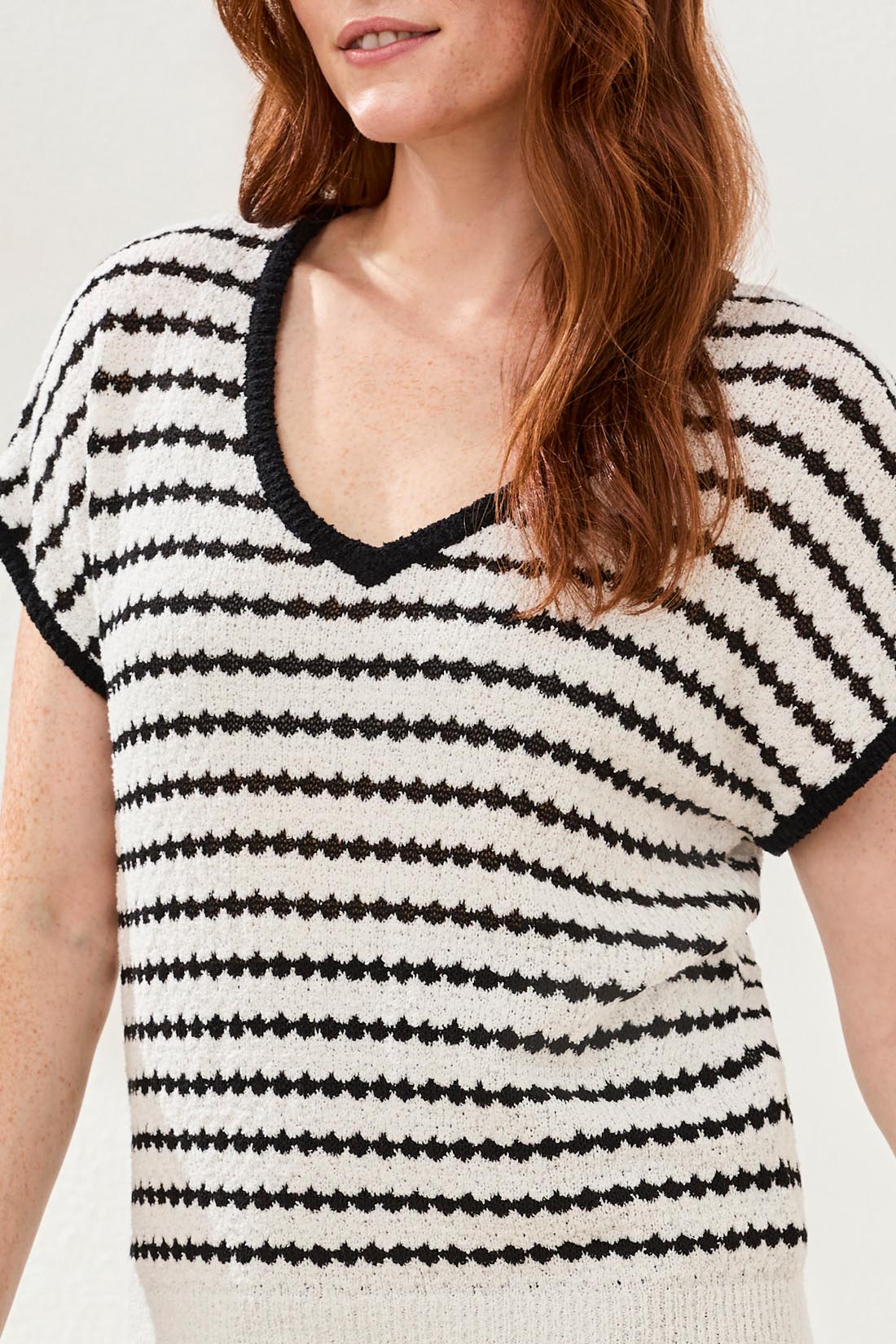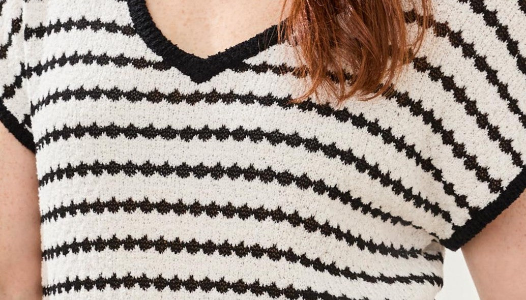 Le design se compose de rayures horizontales noir et blanc formées par un motif tricoté texturé rappelant de petites formes géométriques répétées, créant un effet visuel riche et dynamique. Les extrémités du vêtement sont élégamment soulignées de noir, notamment à l’encolure, au bas des manches ainsi qu’à l’ourlet du bas, apportant une finition contrastante raffinée.