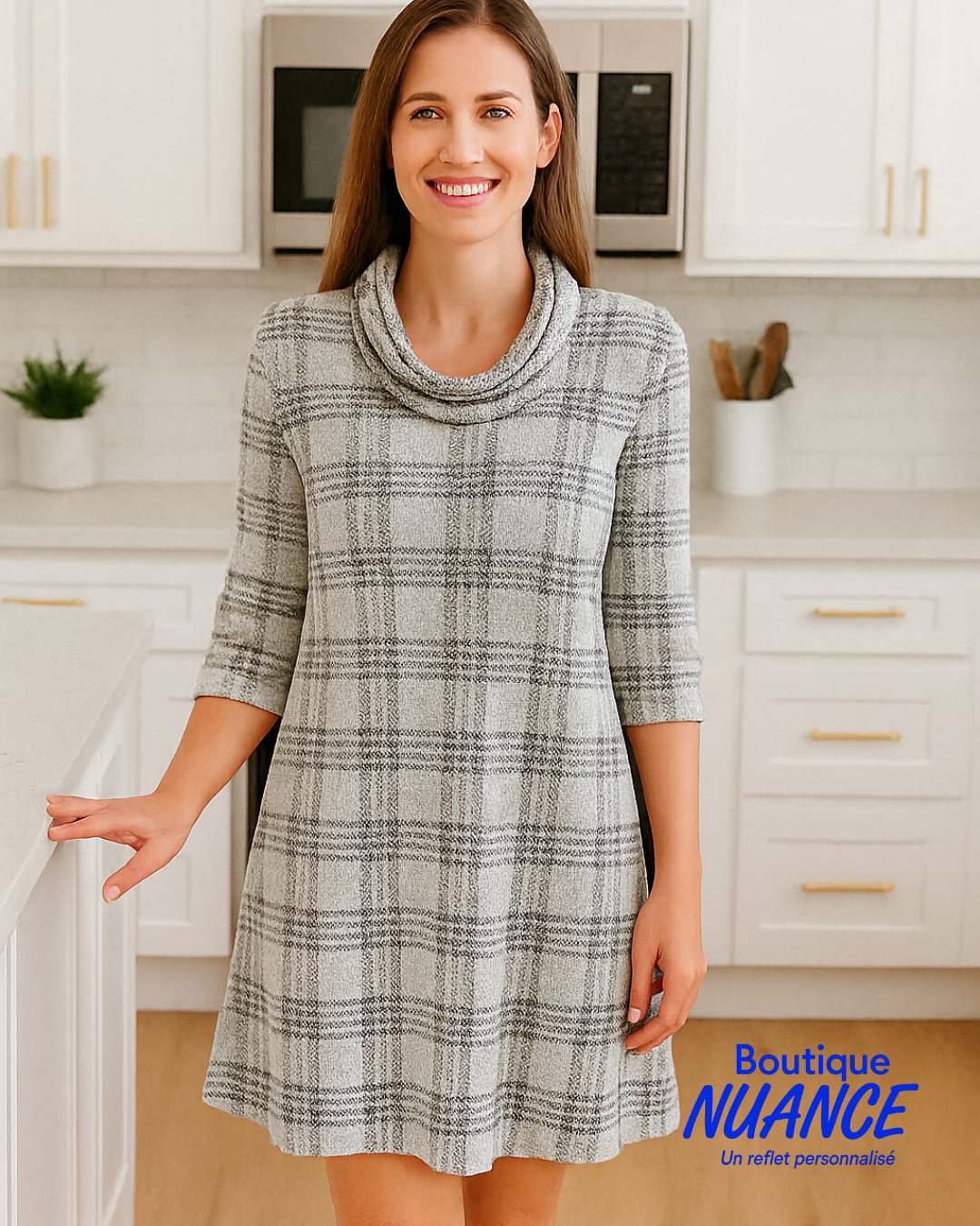 Un imprimé à carreaux linéaires — un motif intemporel qui donne au vêtement son charme moderne et irrésistible.
