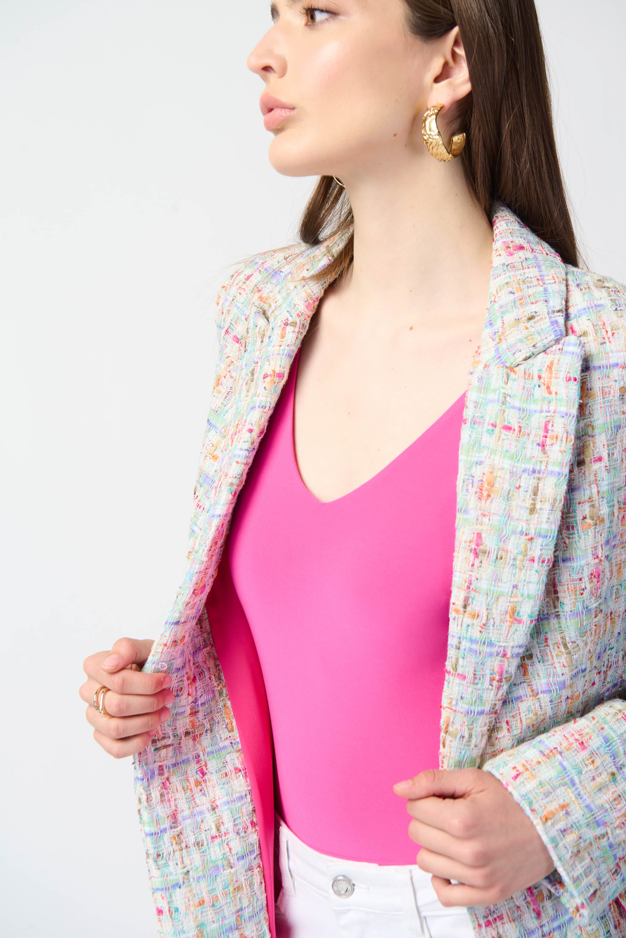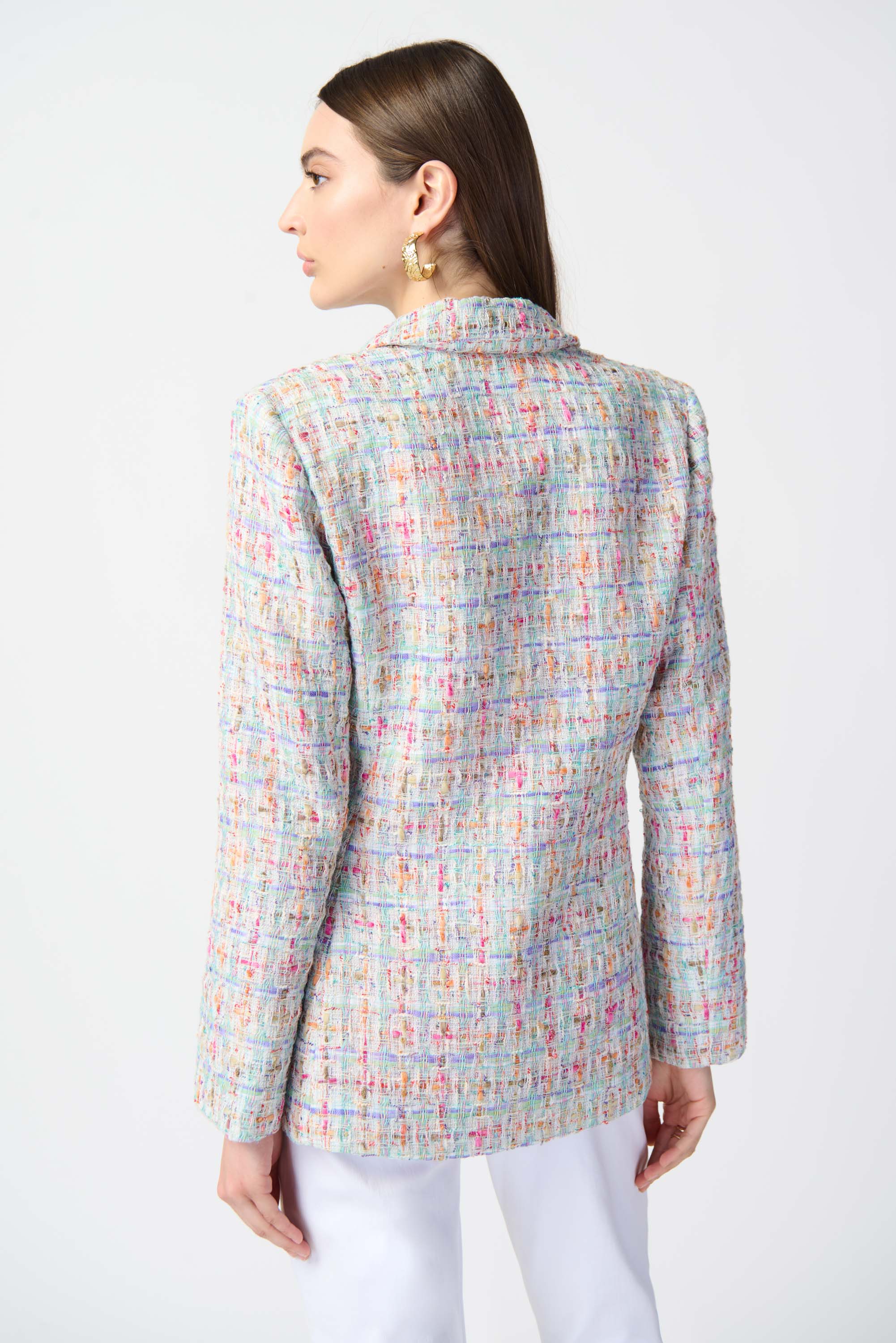 Plongez dans l'élégance sophistiquée avec le magnifique veston ajusté, en tissu bouclé montrant plusieurs couleurs pastel. Une création raffinée de Joseph Ribkoff, pensée pour la femme moderne en quête d'une allure chic et distinguée. Chaque détail de cette pièce incarne l'excellence et le luxe, vous garantissant une silhouette remarquable en toute occasion.